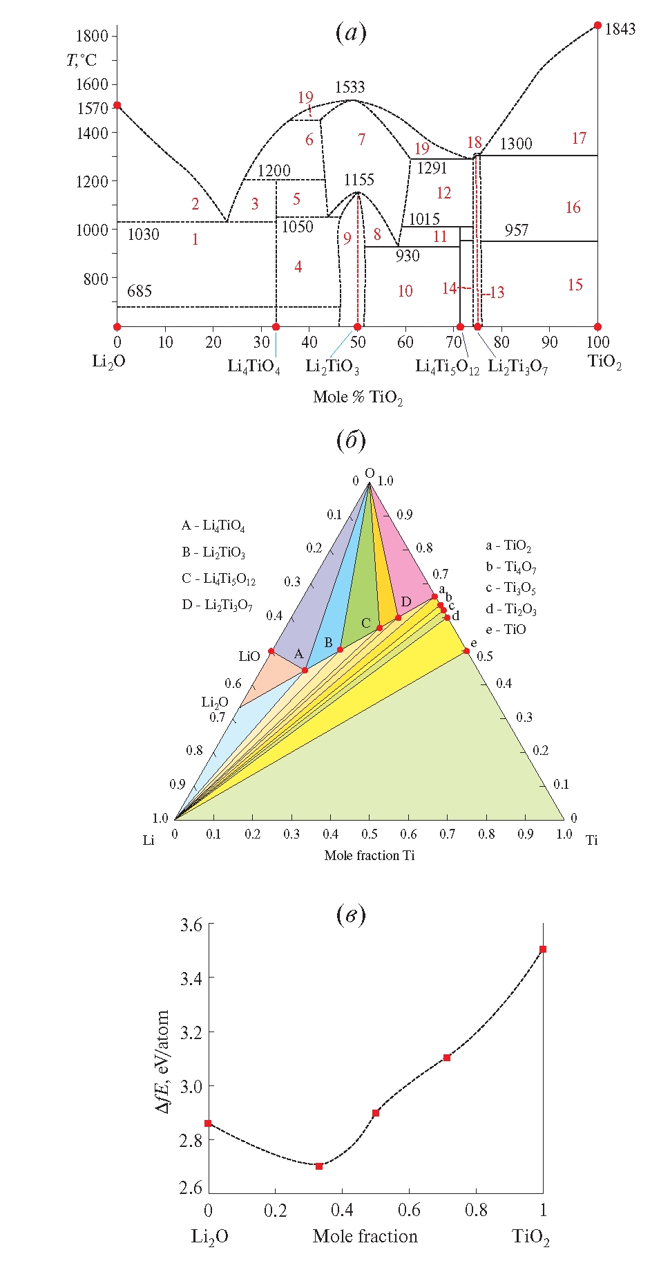 Рис. 2. Уточненная нами фазовая диаграмма (а) системы Li2O–TiO2: 1 — Li2O + Li4TiO4; 2 — Li2O + L (жидкость); 3 — L + Li4TiO4; 4 — Li4TiO4 + β-Li2TiO3 (ss), где ss — твердые растворы; 5 — Li4TiO4 + γ-Li2TiO3 (ss); 6 — L + γ-Li2TiO3 (ss); 7 — γ-Li2TiO3 (ss); 8 — γ-Li2TiO3 (ss) + β – Li2TiO3; 9 — β-Li2TiO3 (ss); 10 — β-Li2TiO3 (ss) + Li4Ti5O12 (LTO); 11 — γ-Li2TiO3 (ss) + (LTO); 12 — γ-Li2TiO3 (ss) + Li2Ti3O7; 13 — Li2Ti3O7; 14 — β-Li2Ti3O7 (ss) + LTO; 15 — β-Li2Ti3O7 (ss) + TiO2; 16 — γ-Li2Ti3O7 (ss) +TiO2; 17 — L + TiO2; 18 — γ-Li2Ti3O7 (ss) + L; 19 — γ-Li2TiO3 (ss) + L; предварительно построенное нами изотермическое сечение (б) системы Li–Ti–O при 298 К; концентрационная зависимость энергии образования тройных соединений (в) в системе Li2O–TiO2. Рассчитанные значения ∆fE для фаз Li4TiO4, Li2TiO3, Li4Ti5O12 лежат на выпуклой оболочке и термодинамически устойчивы.
