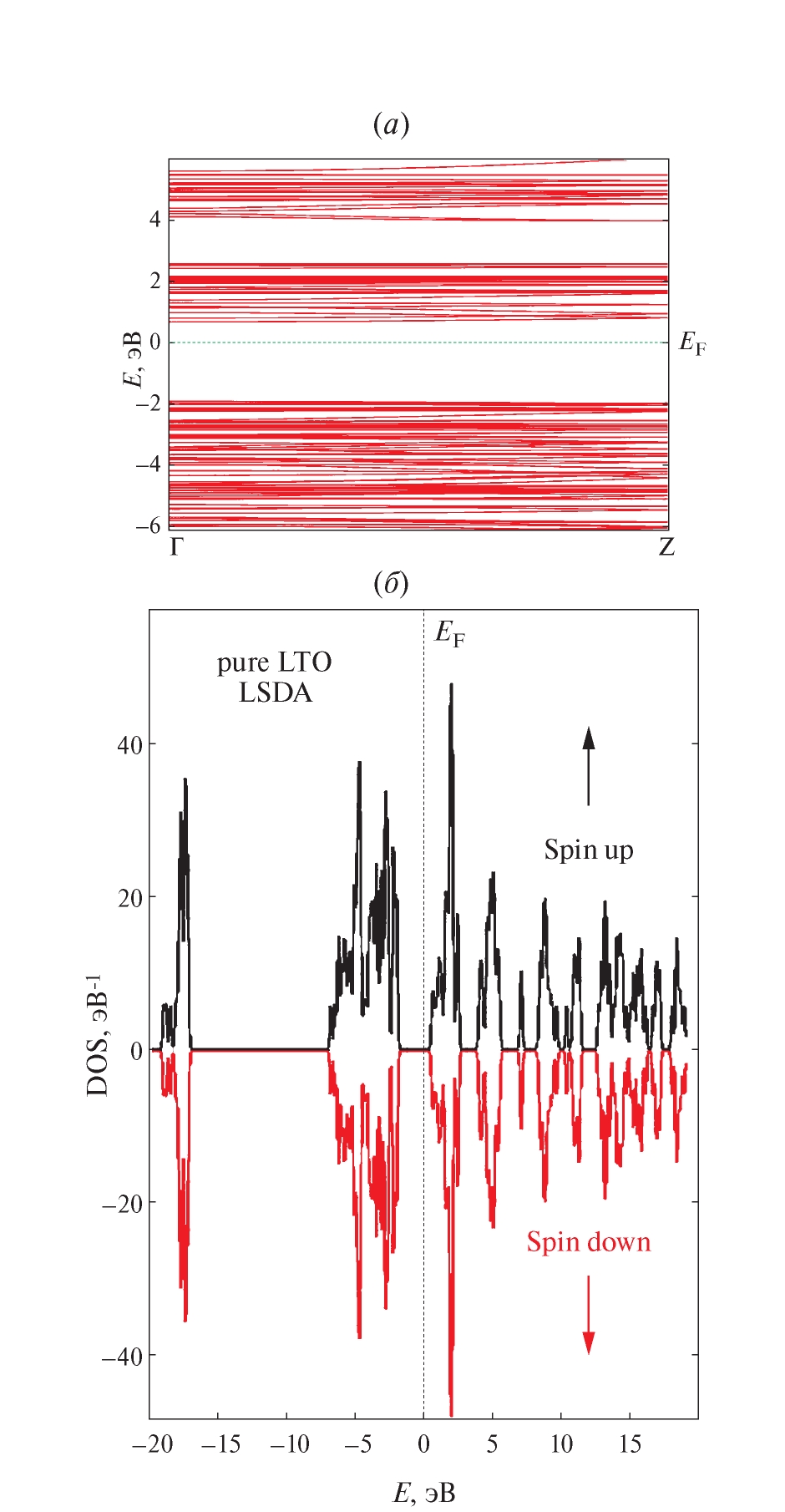 Недостатком LTO как материала анода в LIB является его высокое сопротивление (10–13 См/см). Это приводит к низкой скорости переноса частиц в LIB. Имея это в виду, рассмотрим электронные свойства m-LTO. Электронная структура материала связана с его электрическими свойствами. Запрещенная зона – это характеристика материала и мера электропроводности. Зонная структура чистой суперъячейки LTO нами рассчитана с использованием функционала LSDA.