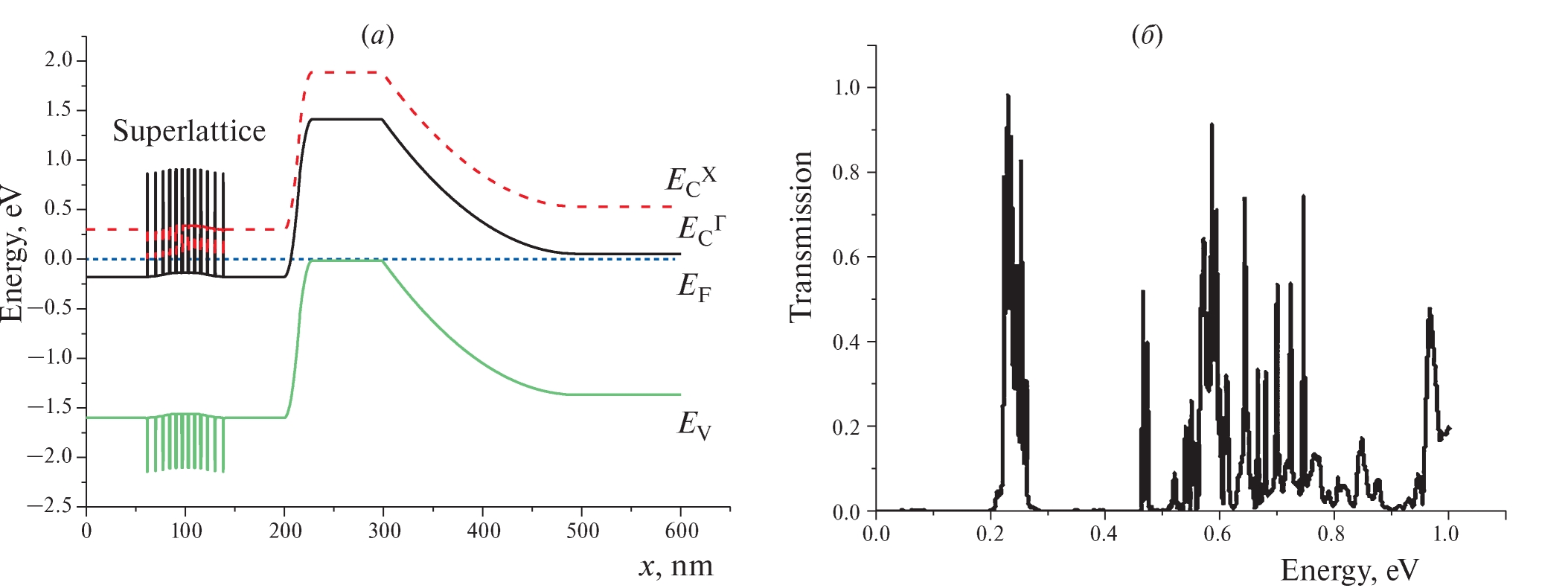 Рис. 1. Зонная диаграмма биполярного транзистора со сверхрешеткой в эмиттерном переходе (а): (―) — энергия потолка валентной зоны EV и дна Г-долины зоны проводимости ; (·) — энергия дна Х-долины зоны проводимости ; (·) — за нулевой энергетический уровень принята энергия Ферми EF; коэффициент прохождения электронов через короткопериодную сверхрешетку при нулевом смещении для константы междолинного взаимодействия α = 0.7 эВ Å (б).