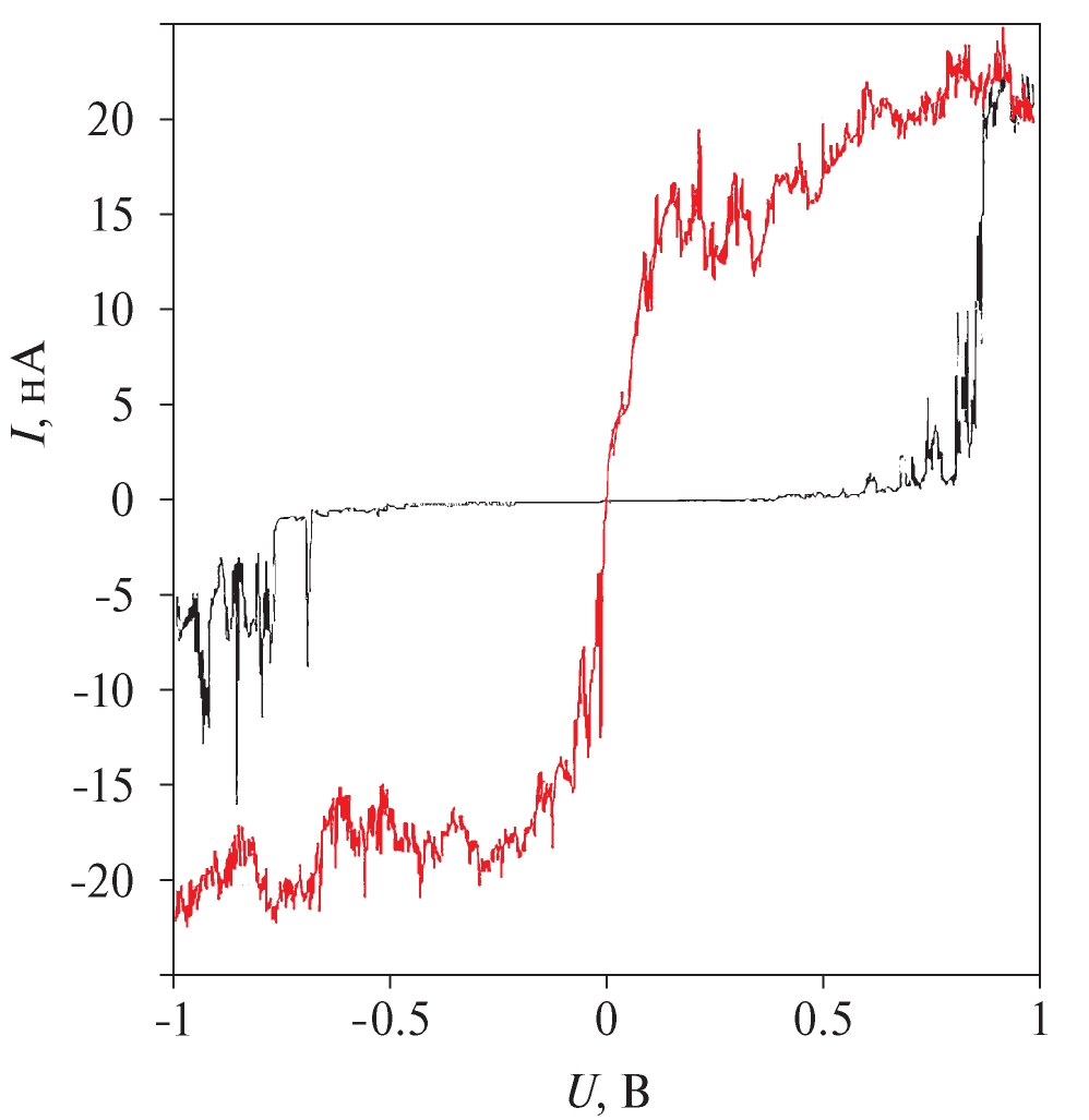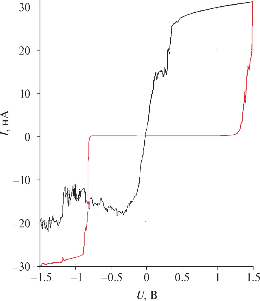 Измерение параметров структуры Si / SiO2 / Ti / TiO2 / Ni проводилось в контактном режиме при подаче импульсов напряжения от –1.5 до 1.5 В. Напряжение записи Uset составило 1.5 В при токе 26 нA. Напряжение сброса Ures = –0.8 В при токе –28 нA.