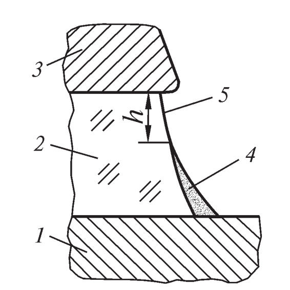Рис. 1. Схематическое изображение открытой “сэндвич”-МДМ-структуры после выполнения электроформовки: 1 – нижний электрод (TiN); 2 – диэлектрик (SiO2) толщиной около 20 нм; 3 – верхний электрод (катод) (Mo, W, TiN); 4 – проводящая наноструктура; 5 – изолирующий зазор с переменной шириной h ≈ 1 нм.