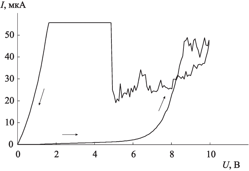 Рис. 4. Типичная ВАХ открытой “сэндвич”-структуры TiN–SiO2–Mo после отжига в высоком безмасляном вакууме 200°C в течение 60 мин и выключения ее коротким импульсом напряжения амплитудой 9 В.