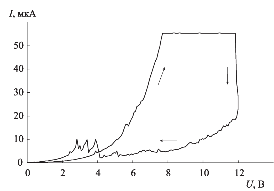 Рис. 6. Вольт-амперная характеристика процесса электроформовки открытой “сэндвич”-структуры TiN–SiO2–Mo при амплитуде треугольного импульса 6 В.