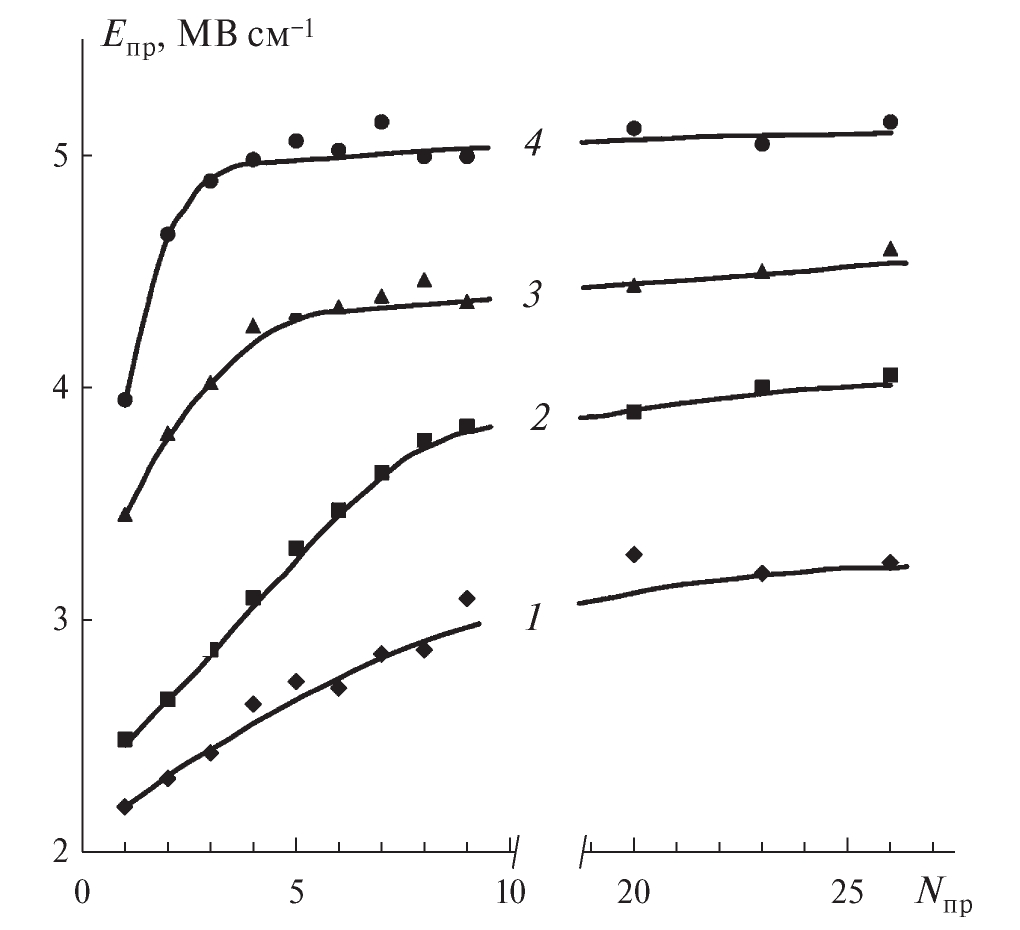 Рис. 3. Зависимость пробивной напряженности поля от числа микропробоев в структурах с однослойным (1, 3) и двухслойным (2, 4) диэлектриком толщиной d2 = 4 нм: 1 – Nb2O5; 2 – (Nb2O5+SiO2); 3 – Ta2O5; 4 – (Ta2O5+SiO2).