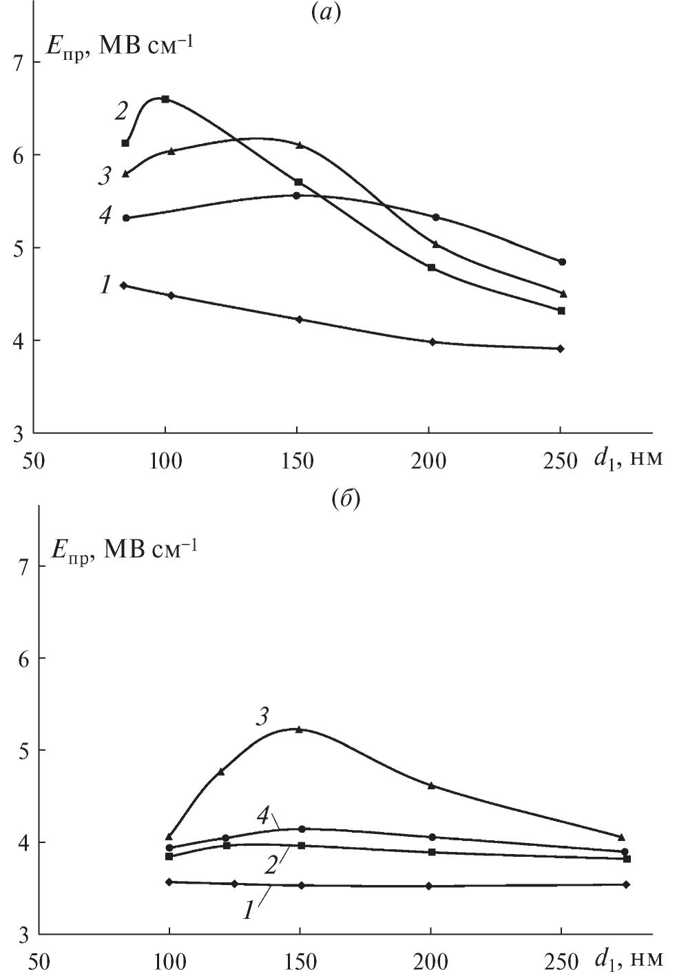 Рис. 4. Зависимость электрической прочности от толщины анодного диэлектрика для структур Ta/Ta2O5/SiO2/Au (a) и Nb/Nb2O5/SiO2/Au (б); кривые: 1 – d2 = 0; 2 – d2 = 3 нм; 3 – d2 = 5 нм; 4 – d2 = 7,5 нм.