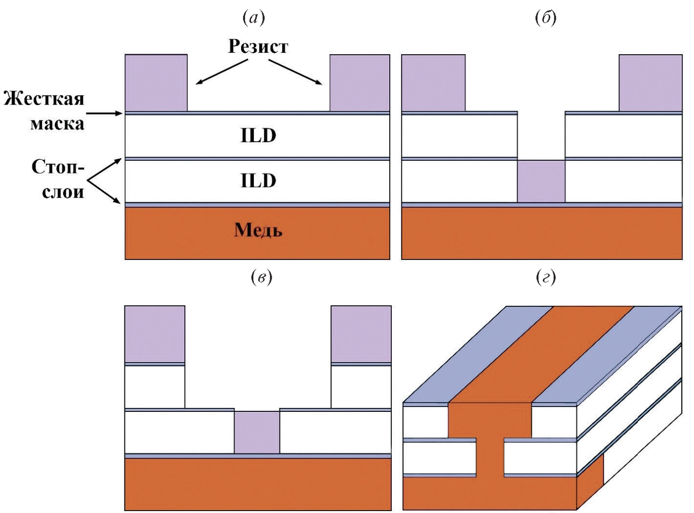 - с помощью литографии формируется маска, и далее производится анизотропное травление ILD до тех пор, пока не будет достигнут нижний стоп-слой. Стоп-слой при этом не вскрывается (рис. 2, а). После этого резист удаляется;