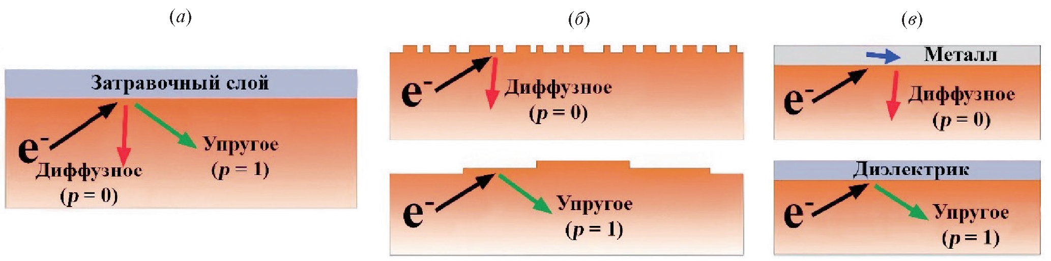 Рис. 5. Поверхностное рассеяние электронов (а) может быть упругим и диффузным. Для преобладания упругого рассеяния требуется (б) атомарно гладкая поверхность и диэлектрический затравочный слой с низкой плотностью локализованных состояний (в).