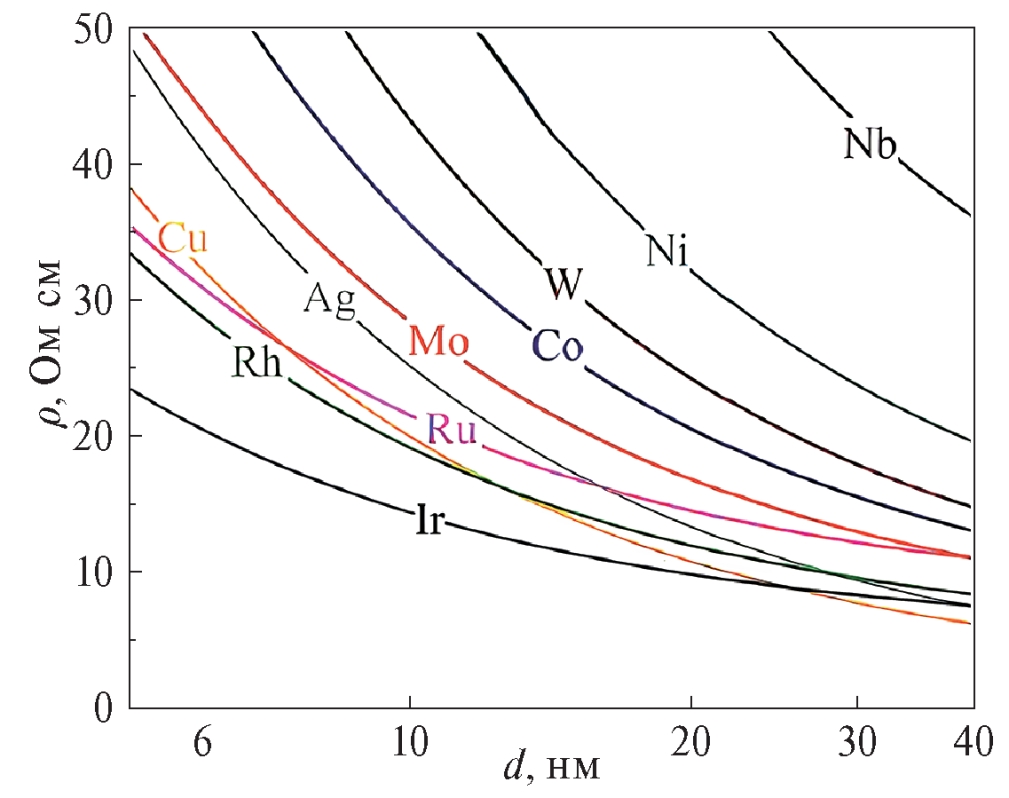 Таким образом, металлы межсоединений, не требующие барьерных слоев, имеющие низкое сопротивление вертикальных контактов, обладающие хорошей устойчивостью к электромиграции, обеспечивают значительные преимущества в проводимости и надежности [9–12]. Поэтому в настоящее время проводятся исследования с целью найти альтернативные материалы для замены меди на нижних уровнях металлизации.