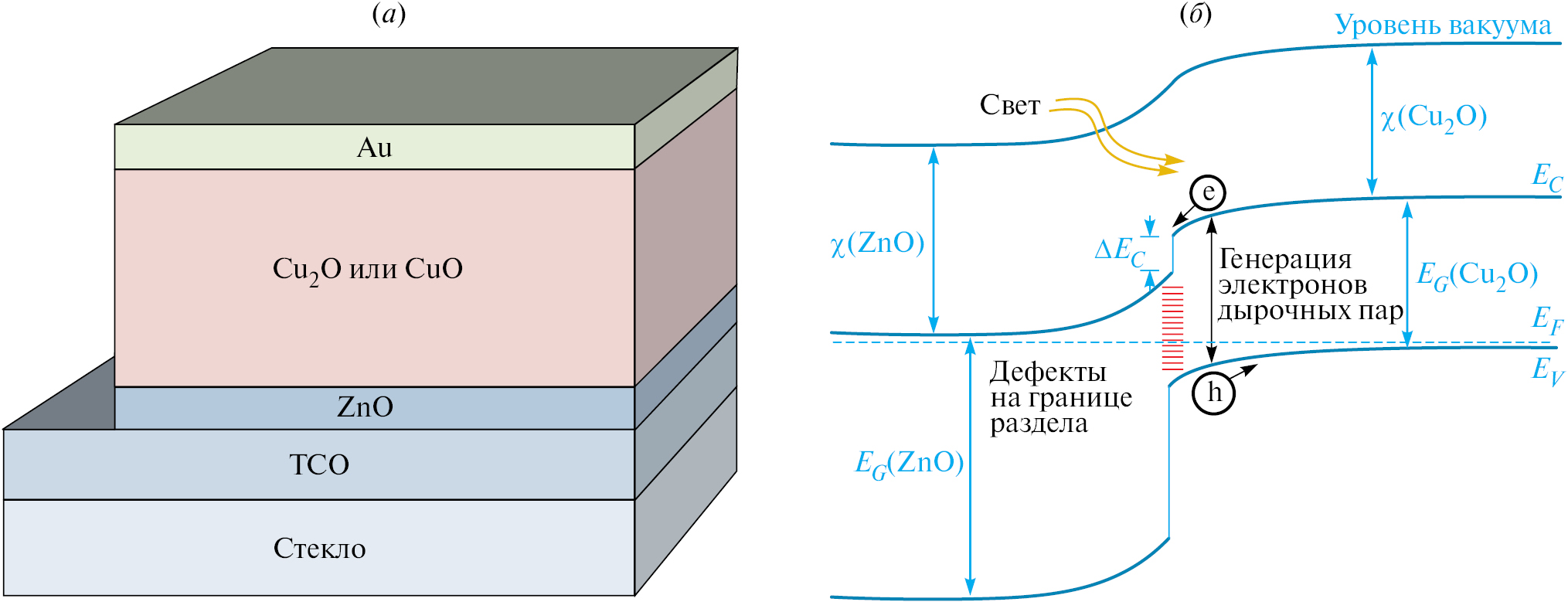 Рис. 1. Схематичное изображение структуры (а) и зонная энергетическая диаграмма (б) неорганического солнечного элемента на основе оксидов меди