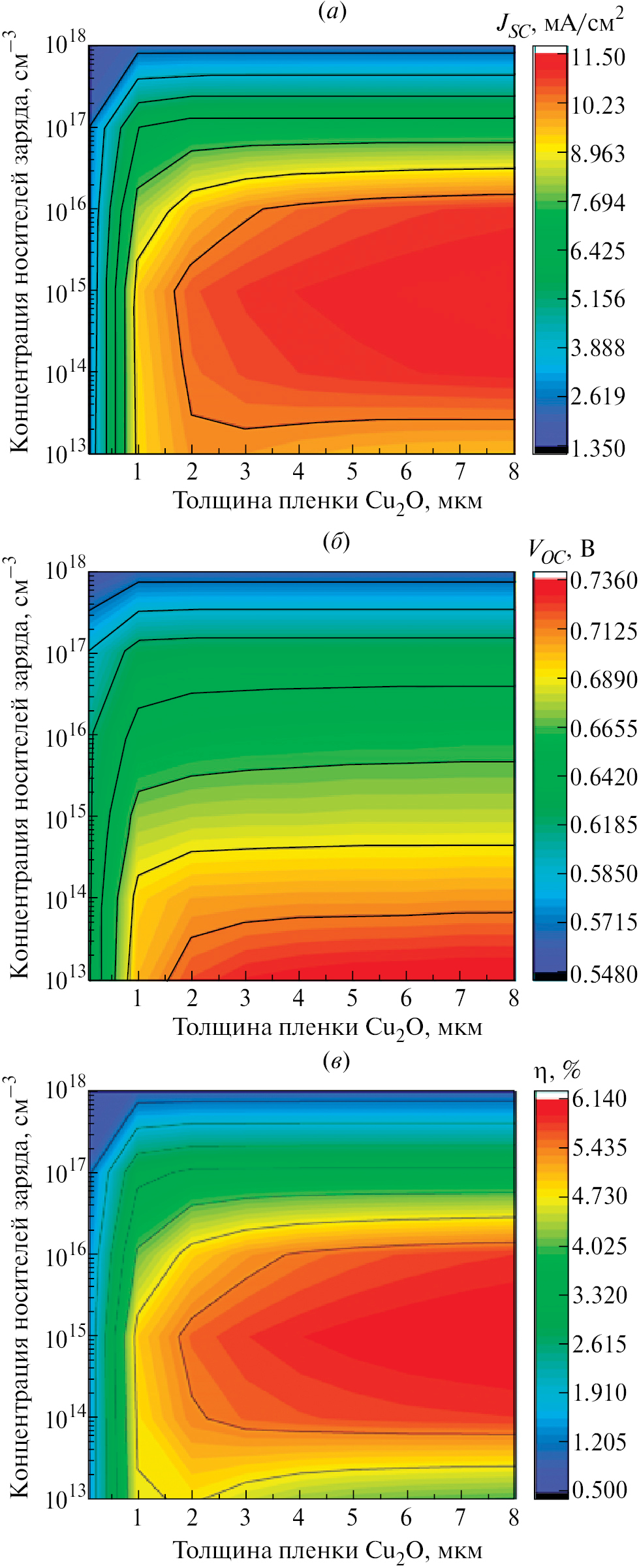 Проведено моделирование влияния толщины и концентрации носителей заряда (акцепторов, вакансии меди) в пленке Cu2O на фотоэлектрические параметры солнечных элементов при толщине пленки ZnO 50 нм и концентрации носителей заряда (доноров, вакансии кислорода) 1019 см–3 и остальных параметрах, представленных в таблице. На рис. 2 представлены полученные контурные графики зависимостей фотоэлектрических параметров солнечного элемента при изменении толщины и концентрации носителей заряда в пленке Cu2O от 0.1 до 8 мкм и от 1013 до 1018 см–3 соответственно.