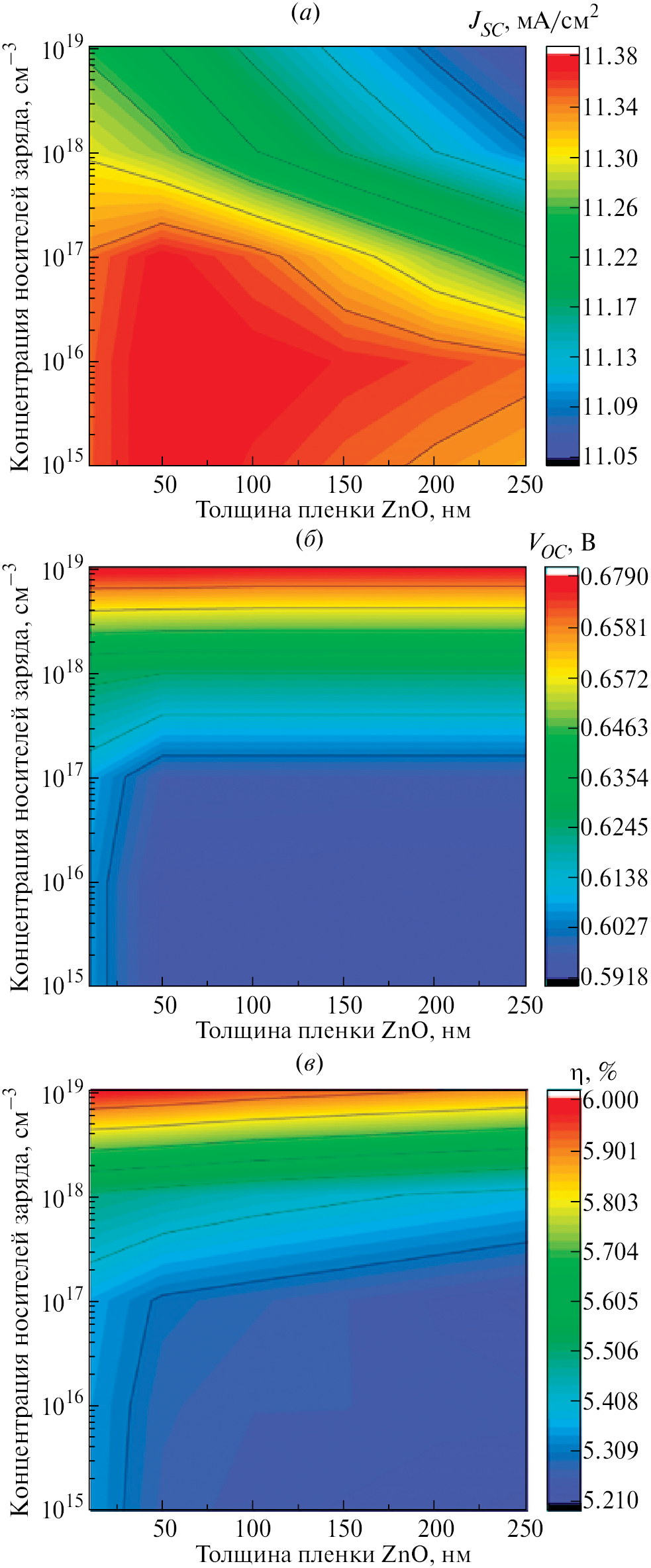 Из рис. 3, а видно, что плотность тока короткого замыкания солнечного элемента изменяется незначительно от 11 до 11.3 мА/см2 при всех толщинах и концентрациях носителей заряда в пленке ZnO, что связано с отсутствием существенного поглощения солнечного излучения пленкой широкозонного окна, поскольку она выступает транспортным слоем для неосновных носителей заряда (электронов) из пленки Cu2O. При каждой концентрации носителей заряда в пленке ZnO с увеличением ее толщины наблюдается небольшое снижение плотности тока короткого замыкания, вызванное рекомбинацией избыточных носителей заряда (электронов из Cu2O и дырок в ZnO).