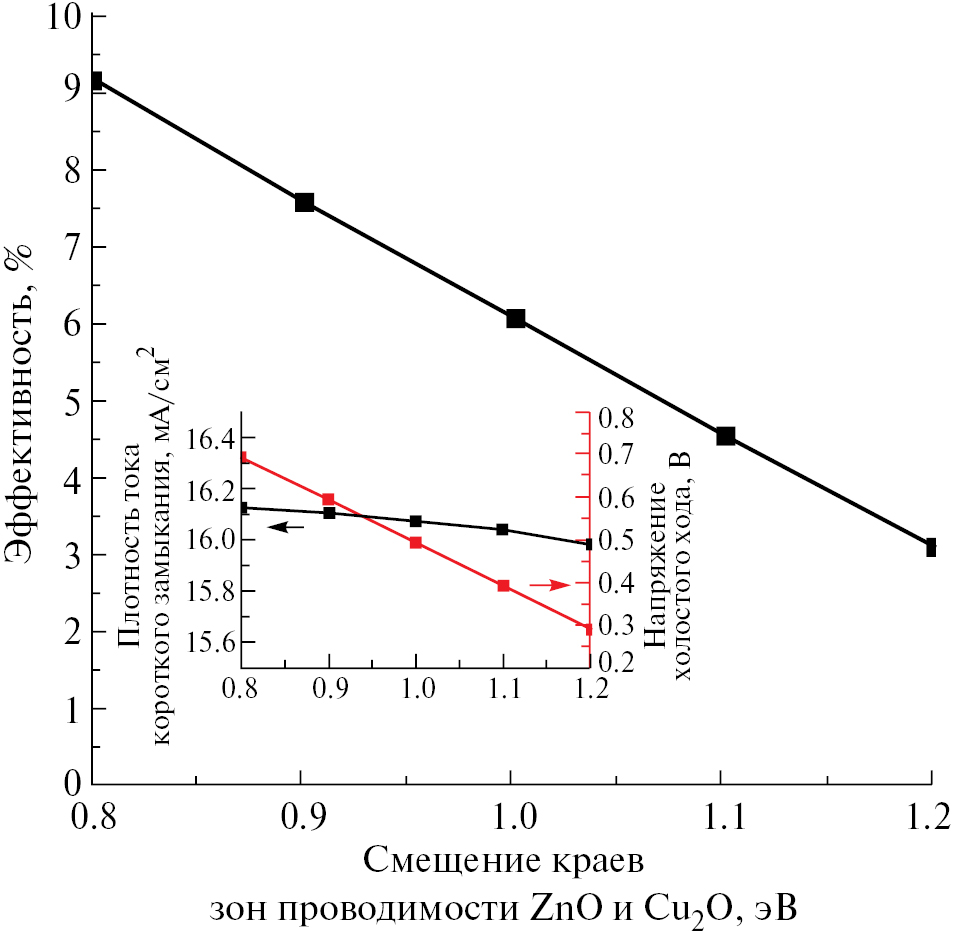 Из рис. 5 видно, что при возрастании величины смещения краев зон проводимости между ZnO и Cu2O от 0.8 до 1.2 эВ (изменение электронного сродства ZnO от 4.0 до 4.4 эВ), плотность тока короткого замыкания незначительно снижается с 16.12 до 15.97 мА/см2, а напряжение холостого хода уменьшается с 0.69 до 0.29 В, что соответствует величине снижения контактной разности потенциалов (потенциального барьера для основных носителей заряда) на гетерогранице ZnO/Cu2O за счет смещения вниз дна зоны проводимости ZnO. Снижение контактной разности потенциалов приводит к возрастанию обратной плотности тока утечки за счет возрастания обратной плотности тока насыщения (8) и увеличения скорости рекомбинации [14, 26]. Таким образом, максимальная эффективность 9.11% достигается при величине электронного сродства ZnO 4.0 эВ.