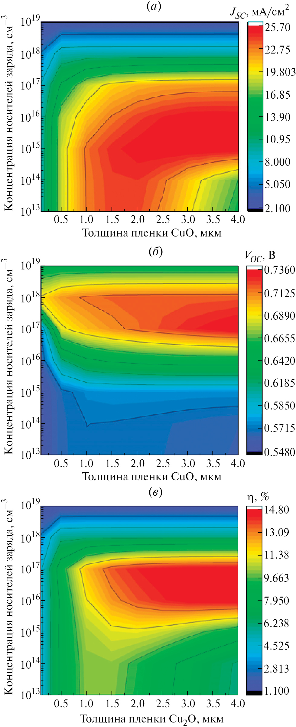 Из рис. 6 видно, что контурные графики плотности тока короткого замыкания и эффективности солнечного элемента для пленки CuO во многом похожи на аналогичные графики для Cu2O, поскольку обе пленки выступают в качестве фотоактивного слоя, где происходит генерация электронно-дырочных пар. Контурный график напряжения холостого хода существенно отличается, что может быть связано с возрастанием контактной разности потенциалов и уменьшением обратной плотности тока насыщения (8) при увеличении концентрации носителей заряда (акцепторов) [13, 14]. Эффективность солнечного элемента возрастает примерно до 14.5% при концентрации носителей заряда от 1016 до 1017 см–3 и увеличении толщины пленки CuO более 2,5 мкм. Таким образом, оптимальная концентрация носителей заряда (акцепторов) в пленки CuO составила 1017 см–3, а в качестве оптимальной толщины выбрано значение 3 мкм, при которых получена эффективность солнечного элемента 14.67%.