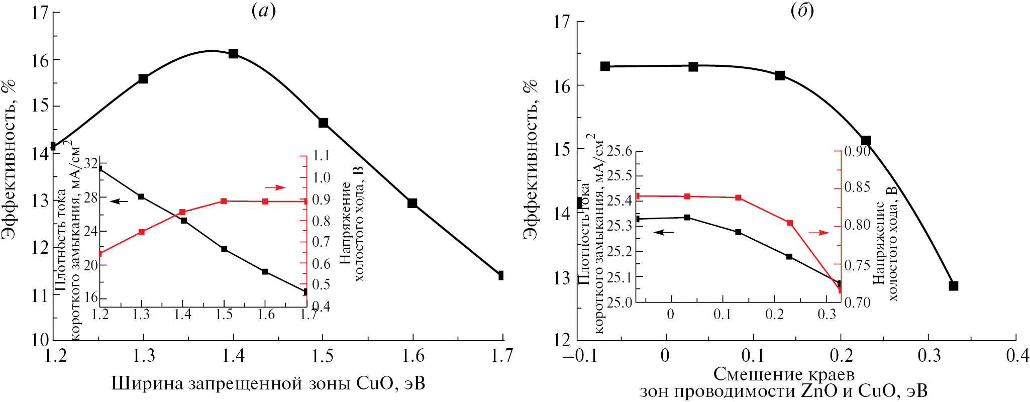 На рис. 7 показаны зависимости эффективности солнечного элемента от ширины запрещенной зоны CuO и от смещения краев зон проводимости между ZnO и CuO. Из рисунка 7 (а) видно, что с увеличением ширины запрещенной зоны CuO происходит уменьшение плотности тока короткого замыкания с 31.07 до 16.76 мА/см2 и увеличение напряжения холостого хода с 0.64 до 0.88 В. Уменьшение плотности тока короткого замыкания объясняется смещением границы поглощения пленки CuO в область с меньшими длинами волн, а увеличение напряжения холостого хода происходит вследствие смещения края (потолка) валентной зоны CuO вниз, что приводит к увеличению контактной разности потенциалов и уменьшению обратной плотности тока насыщения (8) [26]. В результате эффективность солнечного элемента сначала возрастает до 16.15%, а затем снижается до 11.4%. Таким образом, максимальная эффективность достигается при ширине запрещенной зоны CuO равной 1.4 эВ.