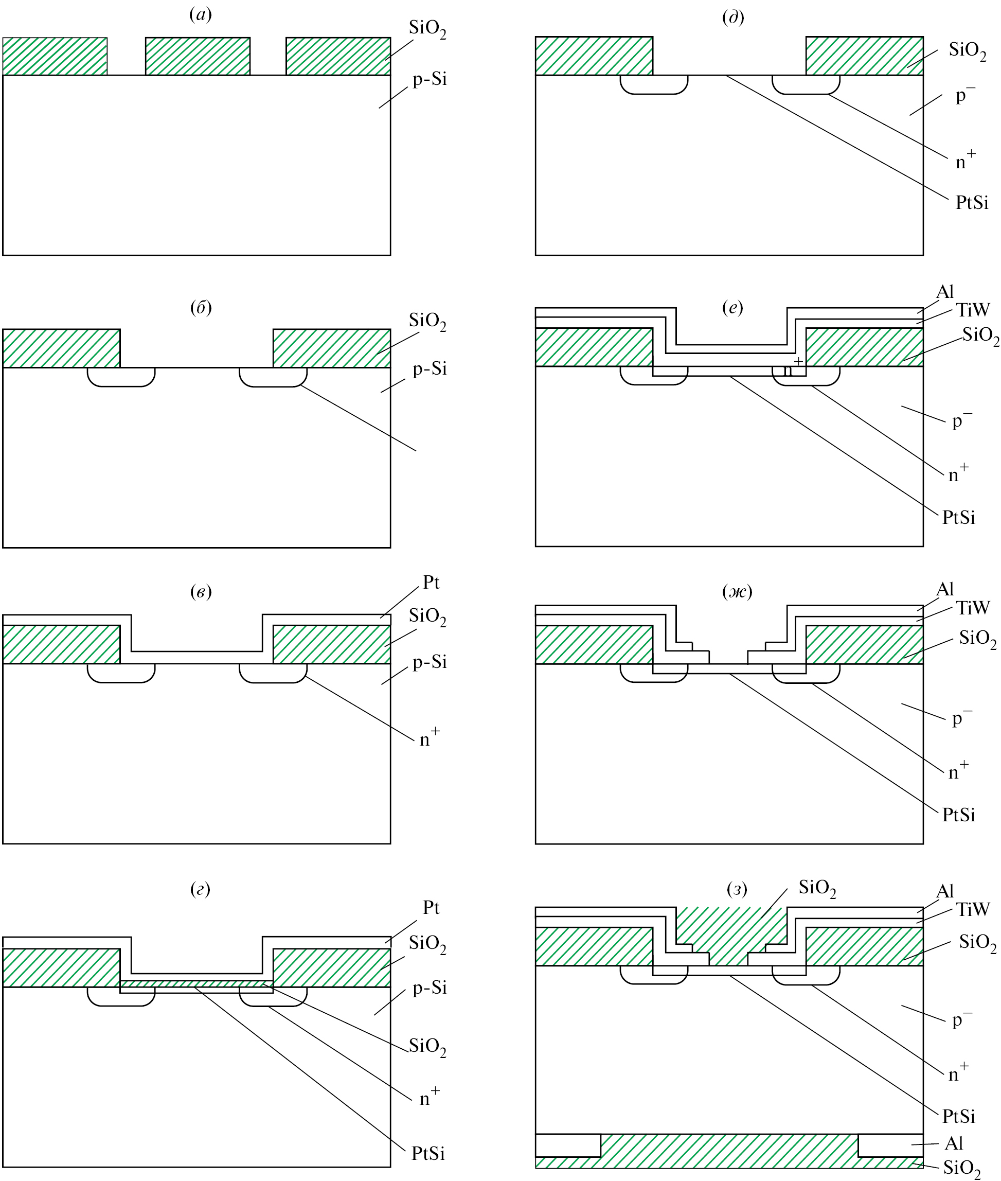 – удаление сплава TiW и Al в контактом окне до пленки PtSi (рис. 1, ж),