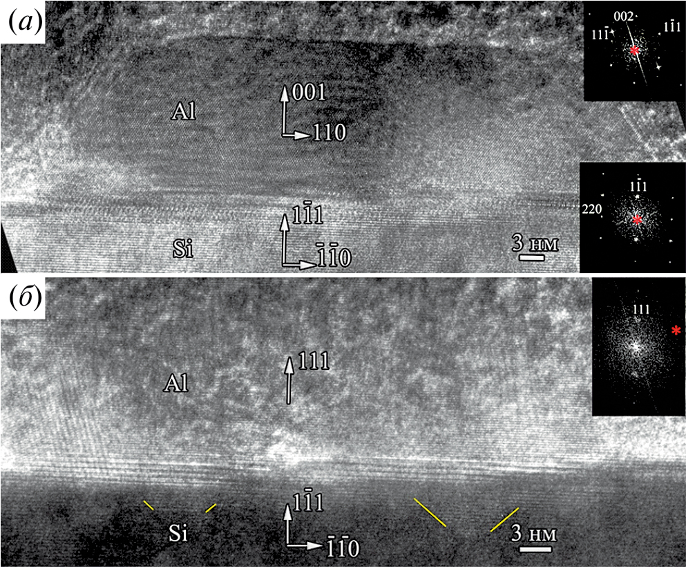 Исследования TEM показывают, что большинство крупных островков в пленке алюминия образца ТА6–3 являются кристаллитами с гранями (001) и (111) параллельными поверхности подложки Si(111). Промежуточных слоев других фаз (например, естественных окислов и т. п.) на границе между кристаллитами и плоскостями кремния не наблюдается. Эти результаты подтверждают эпитаксиальное сращивания кристаллитов алюминия с кремнием при температурах ниже точки эвтектики равной 577°C. Известно [23], что термический отжиг структур Al/Si в диапазоне температур 400–500°C создает через микросплав хороший омический контакт металла с полупроводником. При плавлении происходит растворение остатков оксидного слоя. Этот эффект наблюдался ранее [27] и для Al(111)/Si(001) после термического отжига при температуре 450°C. Недостатком термического отжига является жидкофазная эпитаксия в кремнии, приводящая к формированию “шипов” Si(Al) в матрице подложки на границе пленкой [23]. Присутствие муара на границе раздела и особенности контраста на рис. 5, б показывает формирование твердого раствора Si(Al) в форме шипов-пирамид (отмечено косыми маркерами) размером 3–5 нм в матрице подложки.