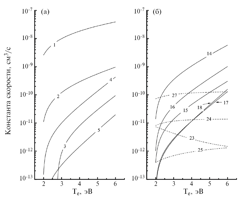 Рис. 1. Константы скоростей реакций под действием электронного удара с участием молекул SF6, приводящие к образованию нейтральных (а) и заряженных (б) продуктов. На рис. б): сплошные линии – ионизация, пунктир – прилипание. Числовые метки на сплошных кривых соответствуют номеру реакции в табл. 1 и 2.