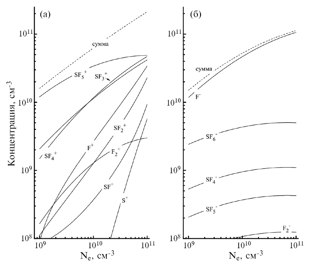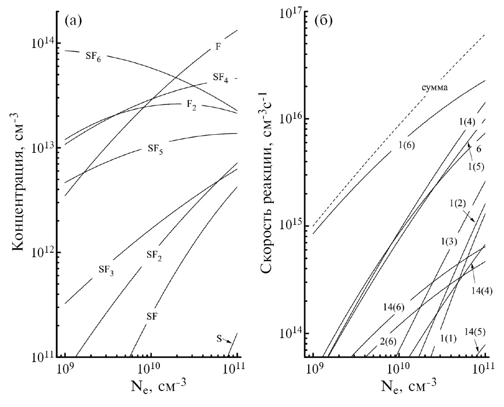 В группе отрицательных ионов (рис. 4(б)) доминирующей частицей является F– (78–94% в составе ) по причине максимальных констант скоростей и скоростей образования этих частиц в реакциях R21 и R27 (x = 6). Заметный, 16%, вклад SF6– в области низких концентраций электронов обусловлен эффективным протеканием беспорогового недиссоциативного процесса R22. Аналогичные диссоциативные механизмы R23–R26, продуктами которых являются SFx– (x = 5–2), характеризуются высоким пороговыми энергиями и меньшими, на порядок величины и более, константами скоростей по сравнению с . Поэтому исключение этих процессов и соответствующих ионов из баланса заряженных частиц не приводит к заметным различиям при определении как суммарной абсолютной (), так и относительной () концентрации отрицательных ионов. В частности, расчеты с использованием сокращенной кинетической схемы показали, что относительная концентрация отрицательных ионов снижается в диапазоне 15.5–1.1 при = 109–1011 см–3, что соответствует переходу от сильно- к умеренно-электроотрицательной плазме. Аналогичные результаты были получены в работах [15] ( ~ 5 при = 2×1010 см–3 и ~ 1 при = 1011 см–3) и [17] ( ~ 12 при = 109 см–3 и ~ 6 при = 1010 см–3) на основе полной кинетической схемы, учитывающей указанные выше не эффективные процессы. Таким образом, предложенная в данной работе сокращенная кинетическая схема обеспечивает адекватное описание стационарного состава плазмы SF6 в типичном диапазоне условий РИТ.
