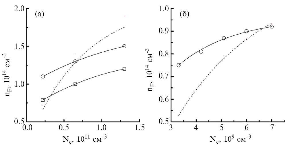 Рис. 3. Сравнение расчетных (пунктир) и экспериментальных (сплошная линия + символы) концентраций атомов фтора из работ [15] (а) и [16] (б). Обе экспериментальные кривые на рис. а) соответствуют одинаковым условиям возбуждения плазмы, но получены при различных значениях актинометрического коэффициента.