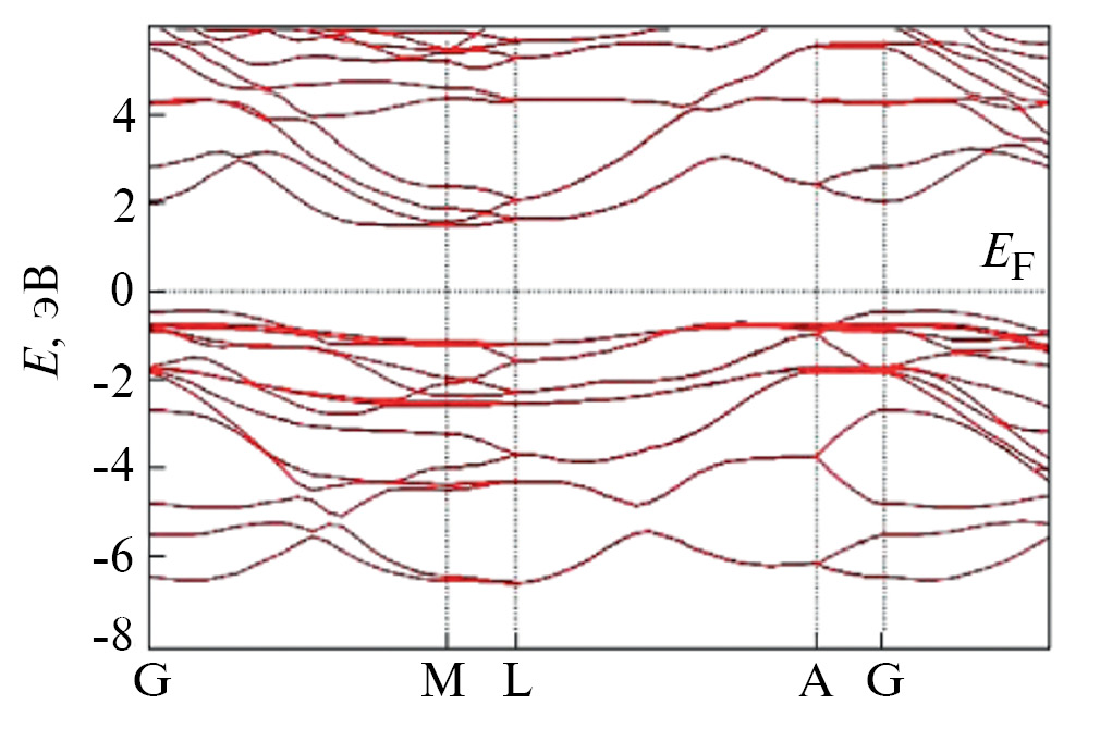 3.1.3. Расчет зонной структуры. Теория функционала плотности со спин-орбитальной связью [22] и коррекцией плотности DC-DFT [26] может повысить точность расчетов зон. Спин-орбитальное взаимодействие (СОВ) – результат взаимодействия внутреннего электронного спина частиц с их орбитальным движением вокруг атомного ядра. СОВ может влиять на энергетический спектр частицы, а также на перенос электрона. В СОВ орбитальное движение электронов создает магнитное поле, которое взаимодействует со спиновым магнитным моментом электрона. При этом энергетический спектр электрона модифицируется и происходит спин-орбитальное расщепление.