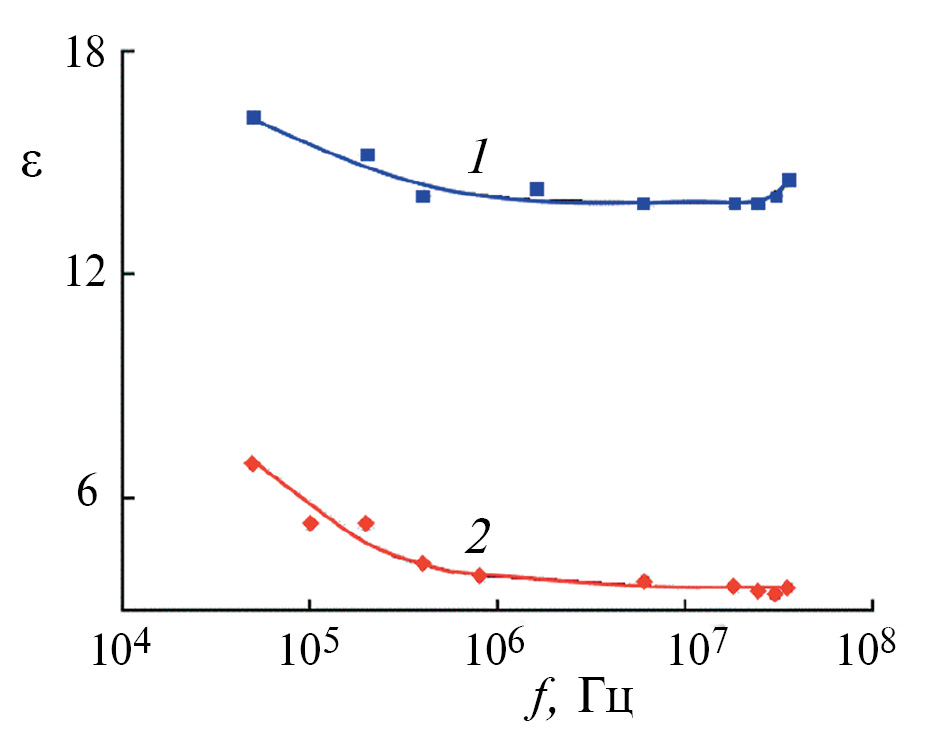 Частотные зависимости диэлектрических функций и проводимости () поперек слоев монокристаллических образцов TlIn1–хСrхS2 в переменных электрических полях измерены в диапазоне частот f = 5 × 104–3.5 × 107 Гц при 298 К.