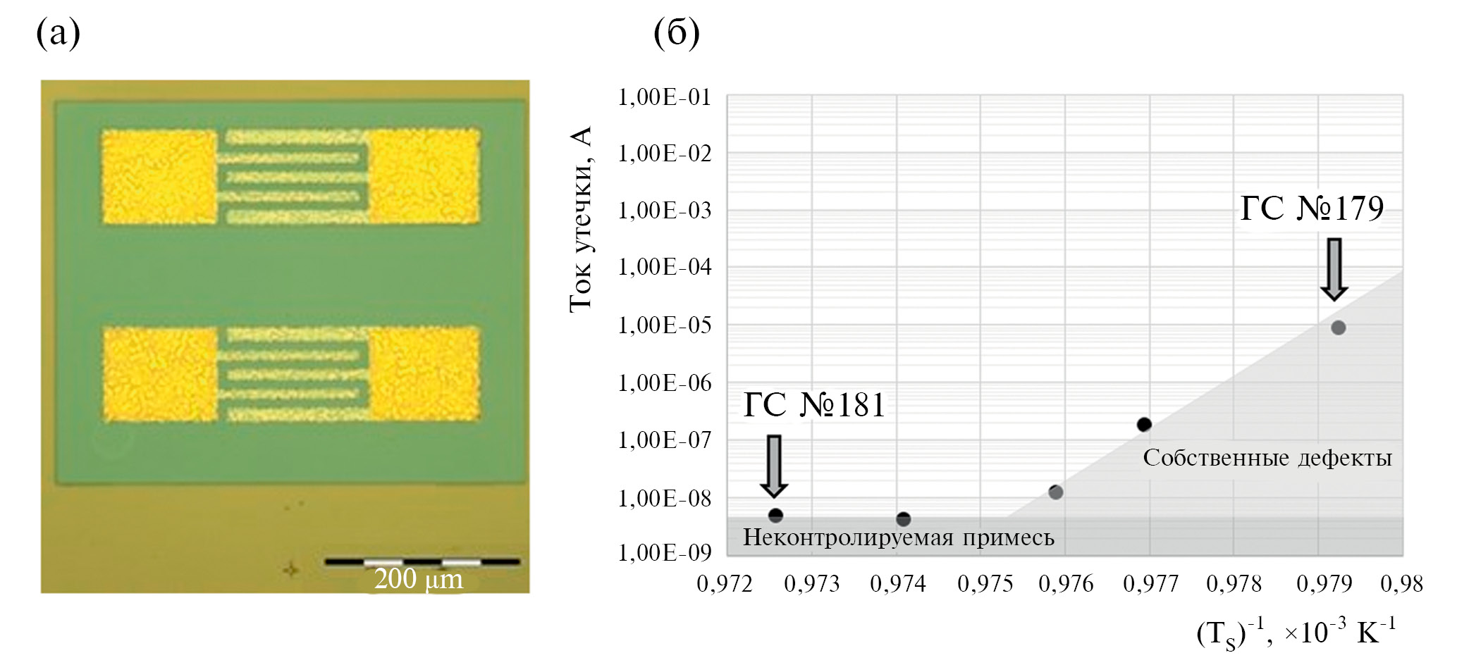 Со стороны меньших температур “окно” низкого слоевого сопротивления (выделено заливкой на рисунке 3, б) ограничено ухудшением изоляционных свойств GaN буфера. Доказательством данному утверждению служат результаты измерений тока утечки через тестовую структуру, топология которой приведена на рис. 4, а. Тест имел встречно-штыревую геометрию с общей длиной мезаструктуры ≈ 0,7 мм. Изоляция “левой” и “правой” гребенок выполнялась путем плазмохимического травления поверхности ГС на глубину до 90 нм через маску из фоторезиста.