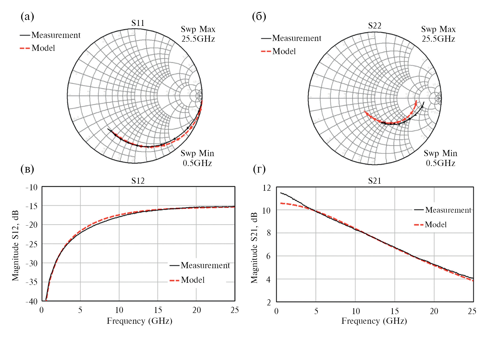 Для характеризации экспериментальных образцов были проведены измерения ВАХ и S-параметров тестового транзистора с шестью затворными секциями шириной 50 мкм. Исследования проводились в частотном диапазоне от 0,5 до 25,5 ГГц. В процессе работы были рассмотрены модели Angelov2, Fujii и EEHEMT, успешно применяемые для параметризации HEMT [45, 46]. Ключевые величины модели определялись путем экстракции внешних и внутренних параметров аналогично методике, представленной в работе [47]. Наилучшую сходимость продемонстрировала модель Angelov2. Процедура ее оптимизации позволила минимизировать расхождения с экспериментальными данными и достичь совпадения характеристик на уровне не менее 92%. В частности, зависимость величины тока стока для модели Angelov2 определяется следующим выражением: