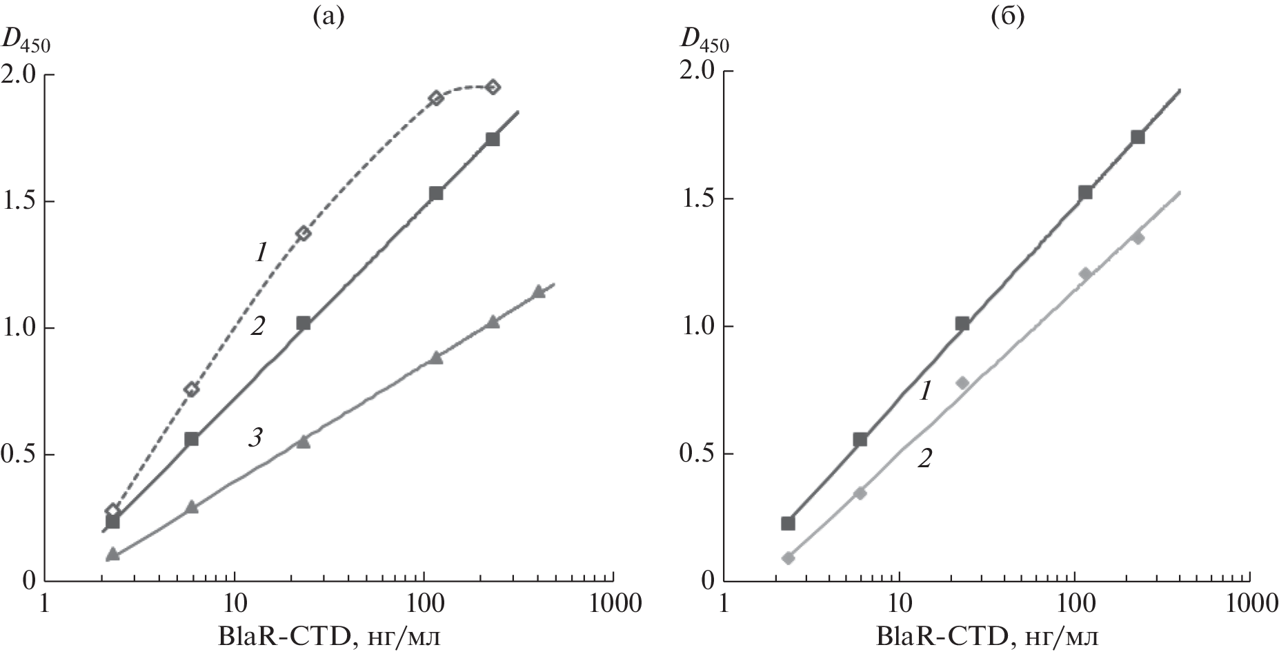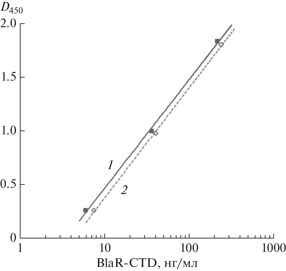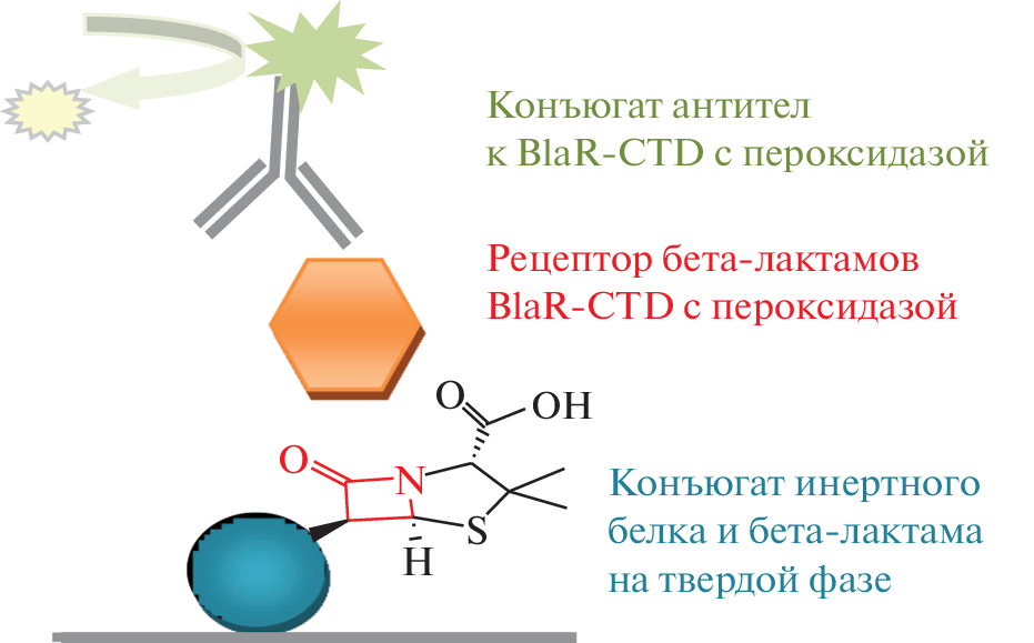 A sandwich bioassay for the quantitative determination of the recombinant beta-lactam receptor BlaR-CTD possessing ligand binding activity and immunoreactivity has been developed. In the bioassay system, BlaR-CTD present in a biological liquid or standard sample binds via its receptor site to ampicillin immobilized in a microplate well and interacts through the epitopes of its peripheral structure with specific polyclonal antibodies. The analytical sensitivity of the method proved to be 2 ng/mL, and its concentration range was 5–215 ng/mL. In the processes of heterological expression, isolation and reagent forms preparation, the biological activity of BlaR-CTD was monitored and its stability was evaluated. High purity recombinant beta-lactam receptor BlaR-CTD was obtained. The protein was shown to have a sufficiently high resistance to denaturation by chaotropic agents (urea and guanidine hydrochloride), and it was stable over a wide pH range. Also, we proposed the constructions and procedures of competitive bioassays for beta-lactam antibiotics using microplates (analytical sensitivity – 0.02 ng/mL, IC50 = 0.28 ng/mL) or chromatographic test-strips (detection limit 1–2 ng/mL), which are based on the receptor and antigenic properties of BlaR-CTD.