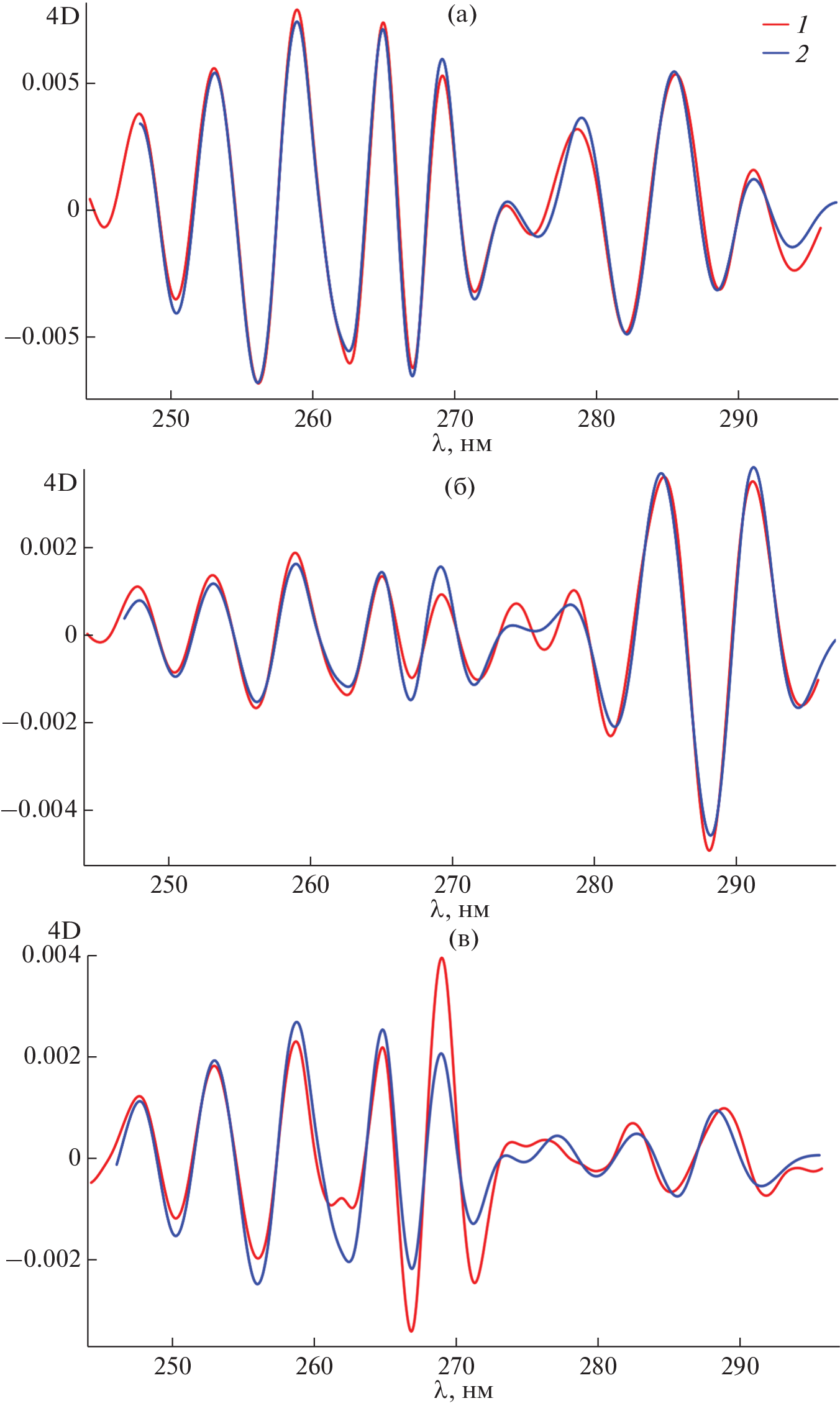 Bovine serum albumin and two oxygen transport proteins, hemocyanin from the snail Achatina fulica and bovine hemoglobin, were used to define what regimens of derivative UV-spectrophotometry are most appropriate for using it as an express technique for nondestructive comparative analysis of native proteins preparations. It was found that the fourth derivatives of proteins absorption spectra make it possible to detect the individual bands of aromatic amino acids in a way optimal for solving certain practical problems. An algorithm for calculating the fourth derivatives was selected experimentally. To verify the approach, the fourth derivatives of the native proteins spectra were reconstructed by combining those of individual aromatic amino acids spectra in the range of 240–300 nm. To demonstrate the individual differences between proteins, it is proposed to use the correlation coefficients of the fourth derivatives of spectra in the range of 240–300 nm or in the wavelength range of tyrosine and tryptophan. Although this approach does not provide for estimating the exact contents of individual aromatic amino acids in proteins, it allows comparing different proteins between each other. The proposed approach makes it possible to obtain an individual spectral “portrait” of a protein, which distinguishes it from other proteins and is useful as a reference for further experimental work with it.