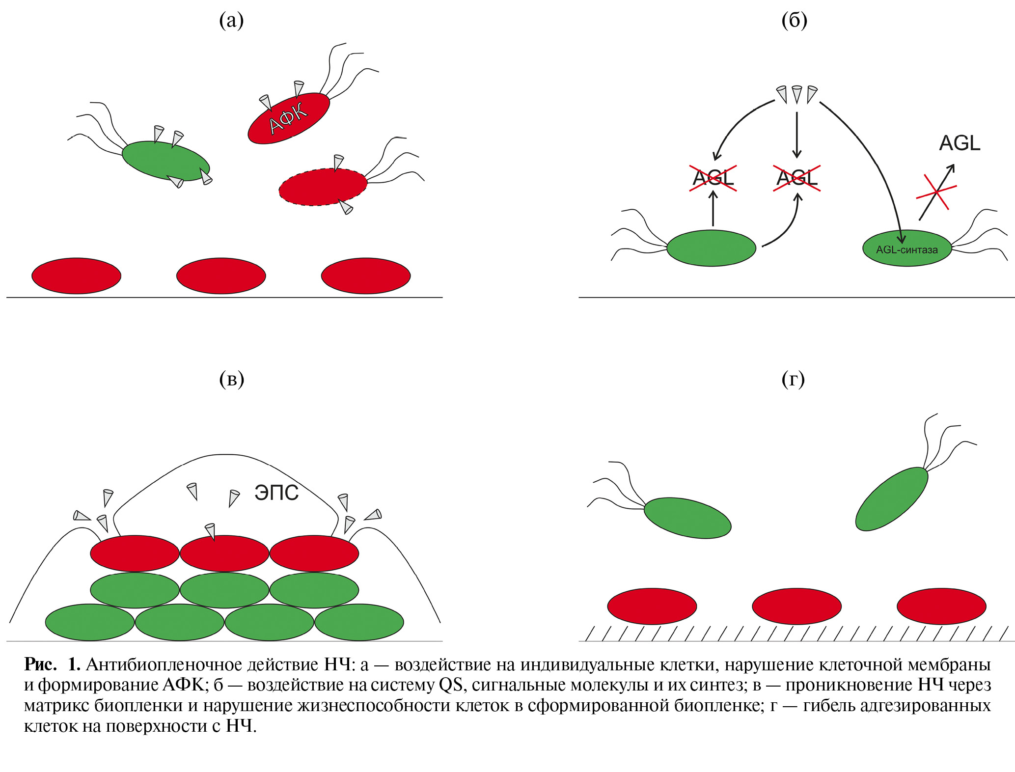 Следует отметить, что НЧ металлов и их оксидов могут влиять на QS, в результате чего подавляют образование биопленки и разрушают уже существующие биопленочные сообщества. Авторы работы [114] показали, что НЧ серебра успешно ингибируют регулируемые QS факторы вирулентности многих бактериальных патогенов. Авторы предполагают, что возможными механизмами воздействия НЧ серебра на систему QS могут быть ингибирование синтеза АГЛ, вмешательство в связывание АГЛ с рецепторными белками, а также антагонизм к регуляторным белкам и нарушение сборки ворсинок, что приводит к снижению биопленкообразования. Удаление аутоиндукторов из непосредственного бактериального окружения препятствует тому, чтобы молекула достигла своего родственного рецептора, тем самым ингибируя взаимодействие сигнал/рецептор и вмешиваясь в нижестоящую регуляцию. В другой работе [115] было показано, что НЧ серебра не только проникают внутрь клетки, нарушая ее физиологические функции, но и связываются с сигнальными молекулами QS, прерывая продукцию QS-опосредованных факторов вирулентности и оказывая антибиопленочный эффект. Авторы предположили, что образование биопленки ингибируется за счет нейтрализации адгезивных веществ, необходимых для ее образования. Антибиопленочная активность НЧ серебра по отношению к P. aeruginosa была вызвана подавлением транскрипционной активности регулонов, кодирующих синтазы LasI и RhlI, необходимые для продукции АГЛ, что нарушало образование и нормальное функционирование биопленки [116]. Еще одно исследование, описывающее ослабление АГЛ-опосредованного распознавания кворума под действием НЧ, представлено в работе [117]. Авторы показали нарушение образования биопленок Listeria monocytogenes, P. aeruginosa PAO1 и E. coli под влиянием НЧ цинка. Продукция ЭПС, способствующих первоначальному прикреплению и созреванию биопленки, была значительно снижена, что приводило к значительному снижению биомассы предварительно сформированных биопленок всех протестированных бактериальных патогенов при обработке субингибирующими концентрациями НЧ цинка.