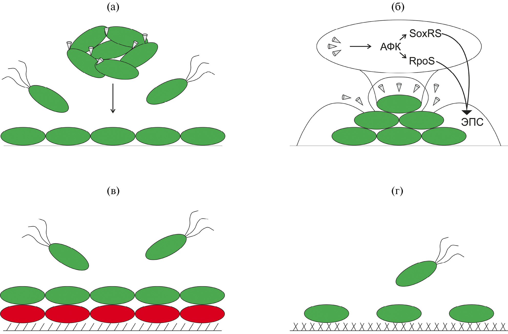 В целом, образование биопленки рассматривается как адаптивная ответная реакция микроорганизмов на стресс. На уровне экспрессии генов процесс образования биопленок достаточно сложен и зависит от многих факторов. Формирование бактериальной биопленки в основном зависит от двух ключевых регуляторных факторов, а именно от системы Quorum sensing (QS) и бис-(3'-5')-циклического димерного гуанозинмонофосфата (c-di-GMP), который является вторичным мессенджером и усиливает выработку внеклеточных полисахаридов [96, 97]. В результате голодания бактериальные клетки снижают количество c-di-GMP за счет активации фосфодиэстеразы, что способствует расселению клеток биопленки [98]. Также известно, что сигма-субъединица РНК-полимеразы RpoS играет большую роль в формировании биопленки. Во время формирования биопленок E. coli было показано, что активация гена rpoS способствует созреванию биопленки за счет возрастания уровня экспрессии генов, участвующих в адгезии и реакции на стресс, и подавления генов, участвующих в синтезе жгутиков и энергетическом метаболизме [99]. Показано, что в ответ на присутствие карбоксилированных УНТ в среде увеличивалась экспрессия rpoS в клетках E. coli [71]. При окислительном стрессе у бактерий увеличивалась экспрессия генов, связанных с секрецией ЭПС, ростом биопленки и устойчивостью к антибиотикам [100].