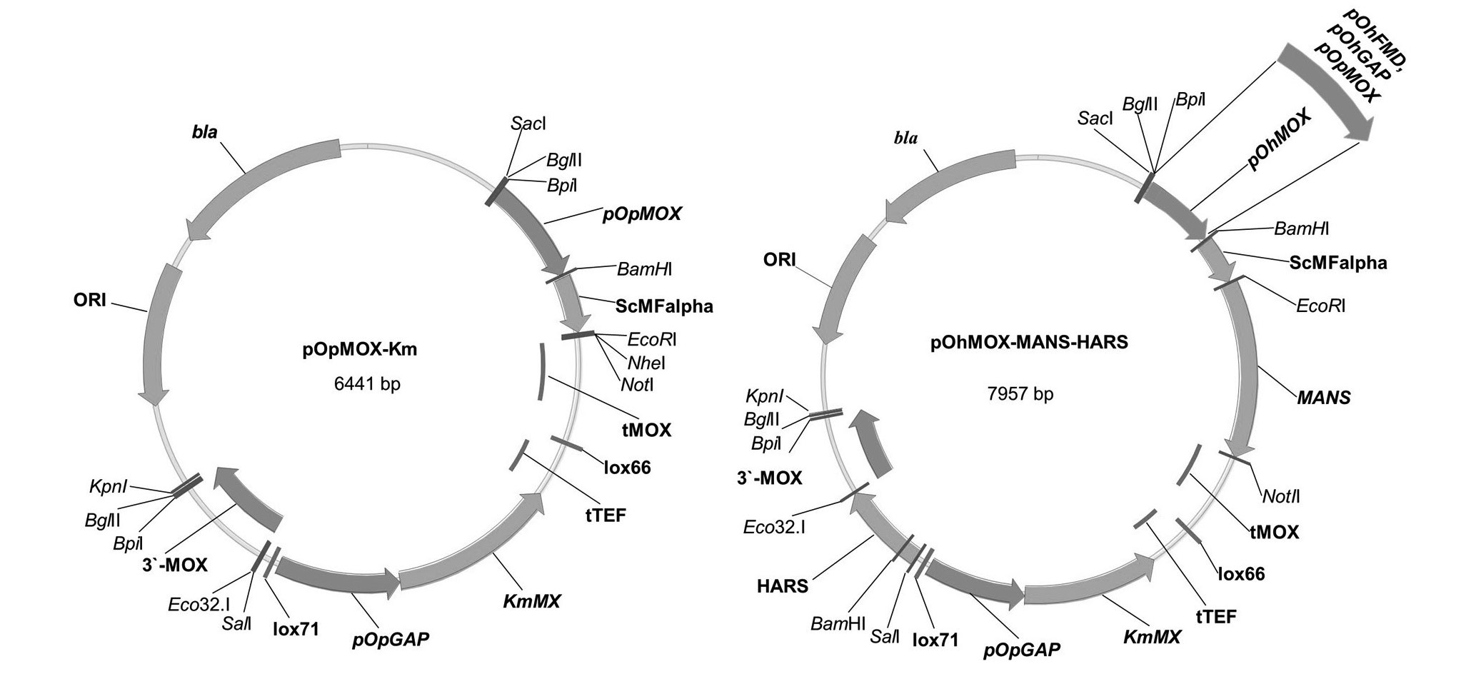 2. Fig. 1. The scheme of the expression vector pOpMOX-Km (a) and the plasmid pOhMOX-MANS-HARS (b). The promoters of pOhFMD, pOhGAP and pOpMOX contain the plasmids pOhFMD-MANS-HARS (7986 bp), pOhGAP-MANS-HARS (8091 bp) and pOpMOX-MANS-HARS (7993 bp), respectively.