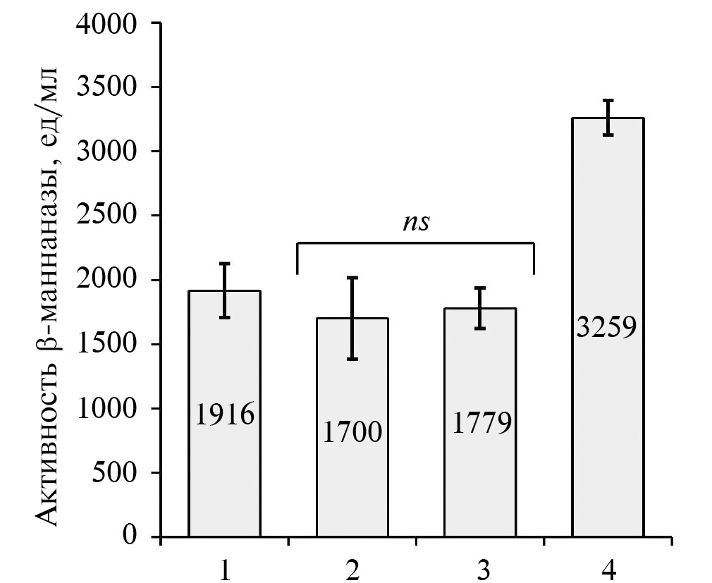 4. Fig. 3. Mannanase activity levels (U/ml) in samples with the MANS gene under the control of the promoters: 1 — pOpMOX; 2 — pOhGAP; 3 — pOhFMD; 4 — pOhMOX. Error bars show the standard deviation of the mean activity of 12 transformants. p < 0.05, ns — not significant difference.