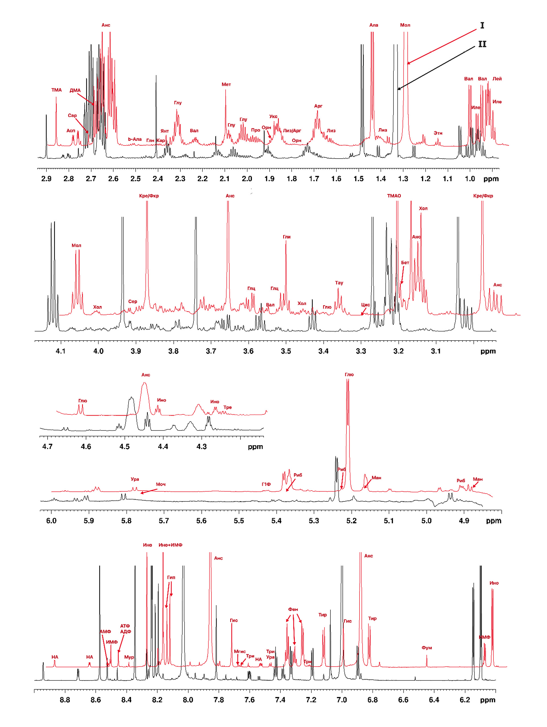 Рис. 3. Cпектры ЯМР 1Н экстрактов мышечной ткани образцов кеты № 5 (I) и № 10 (II).