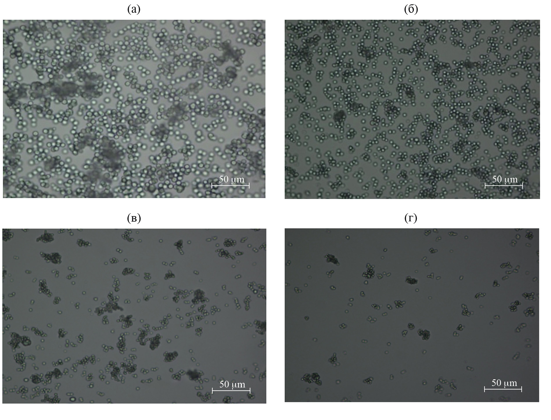 Рис. 1. Влияние скорости перемешивания солей CaCl2 и Na2CO3 на форму и размер частиц СаСО3: а — 400, б — 600, в — 800, г — 1000 об./мин.