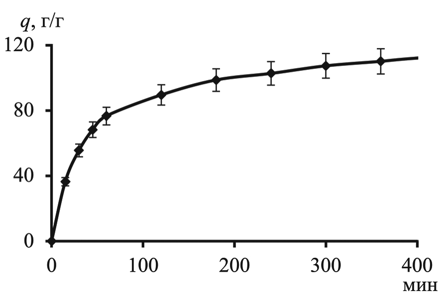 Наиболее важными параметрами при оценке материалов, используемых для регенерации тканей и в системах доставки лекарственных средств, являются скорость и степень их влагопоглощения. Способность КАГ к влагопоглощению изучали весовым методом, в качестве модельной среды использовали забуференный фосфатом физиологический раствор с pH 7.4, моделирующий раневую среду. Ввиду одинаковых текстурных характеристик, кривые влагопоглощения всех 4 образцов КАГ практически совпадали, поэтому в работе приведены результаты влагопоглощающей способности на примере образца КАГ400. Поглощение среды КАГ обусловлено простым капиллярным всасыванием и раздвижением элементов структуры вследствие возникновения расклинивающего давления с последующим заполнением образовавшихся промежутков жидкой средой. Представленная на рис. 2 кривая влагопоглощения КАГ400 имеет вид, характерный для ограниченно набухающих систем, и свидетельствует о высокой скорости набухания КАГ. Отметим, что максимальное влагопоглощение достигает 110 г/г, что значительно выше, чем у аэрогельных материалов на основе АЛГ или ХТЗ (7–80 г/г), и позволяет отнести полученные материалы к суперадсорбентам [32, 33]. Достоинством полученных КАГ является формоустойчивость при влагопоглощении в широком диапазоне рН, что наряду с развитой пористой структурой и полиэлектролитной природой позволит использовать полученные КАГ в качестве аппликационных материалов.