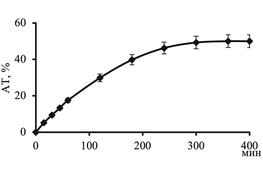 Введение АТ в матрицу КАГ400 проводили в статических условиях путем погружения материала в 40%-ный водно-этанольный раствор АТ с последующим выдерживанием в течение 5 ч при 20C. Содержание АТ в матрице материала составило 5 мг/г. Как показано на рис. 3, высвобождение основного количества включенного АТ из матрицы аэрогельного материала происходило в течение 4 ч. Максимальное высвобождение АТ составляло 50% от общего количества АТ, загруженного в матрицу материала, что обусловлено особенностями пористой структуры КАГ400 и высокой способностью к влагопоглощению.