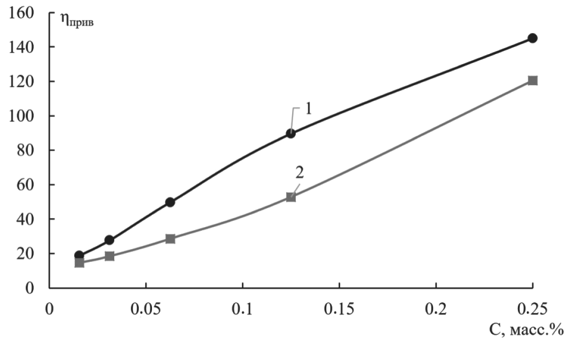 Рис. 1. Зависимость приведенной вязкости от концентрации комплекса: 1 — раствор ХТЗ-М, MМ 566 кДа, pH 4.3; 2 — раствор хитозана, MМ 570 кДа, pH 4.3.