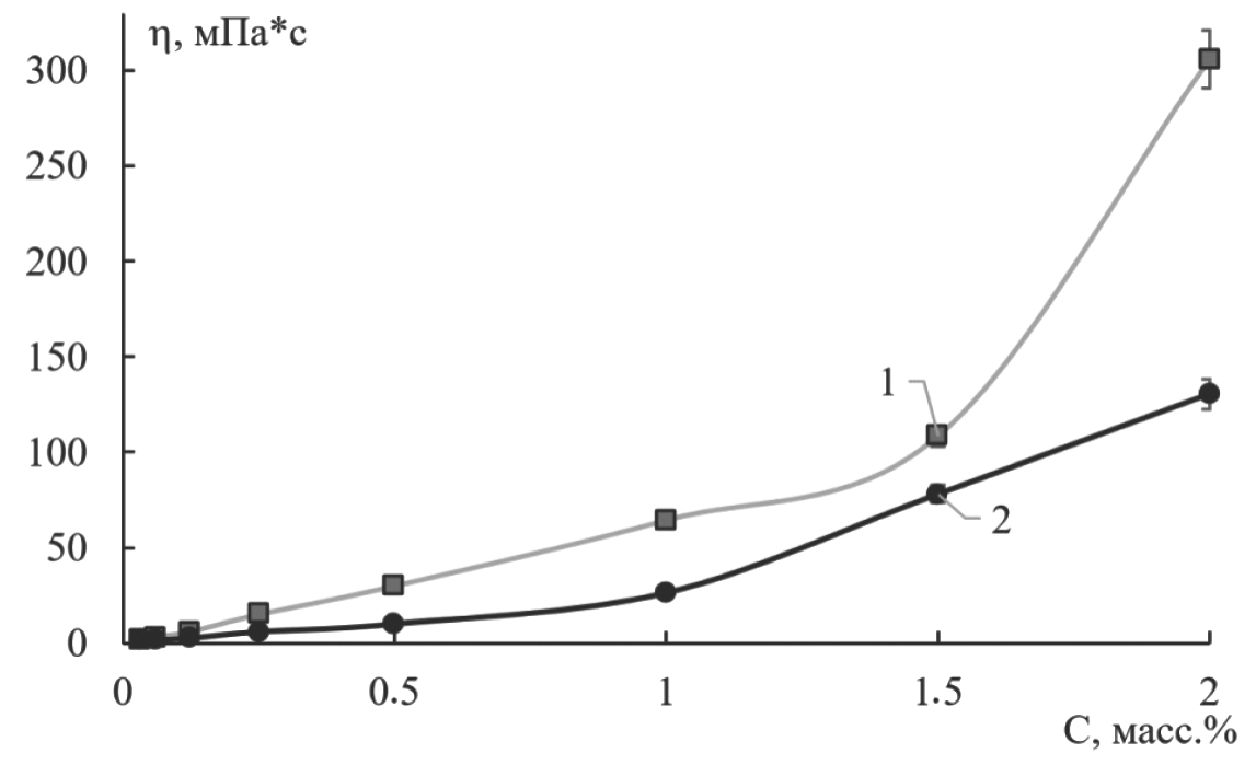 Рис. 2. Зависимость динамической вязкости от концентрации комплекса: 1 — раствор ХТЗ-М, MМ 566 кДа, pH 4.3; 2 — раствор хитозана, MМ 570 кДа, pH 4.3.