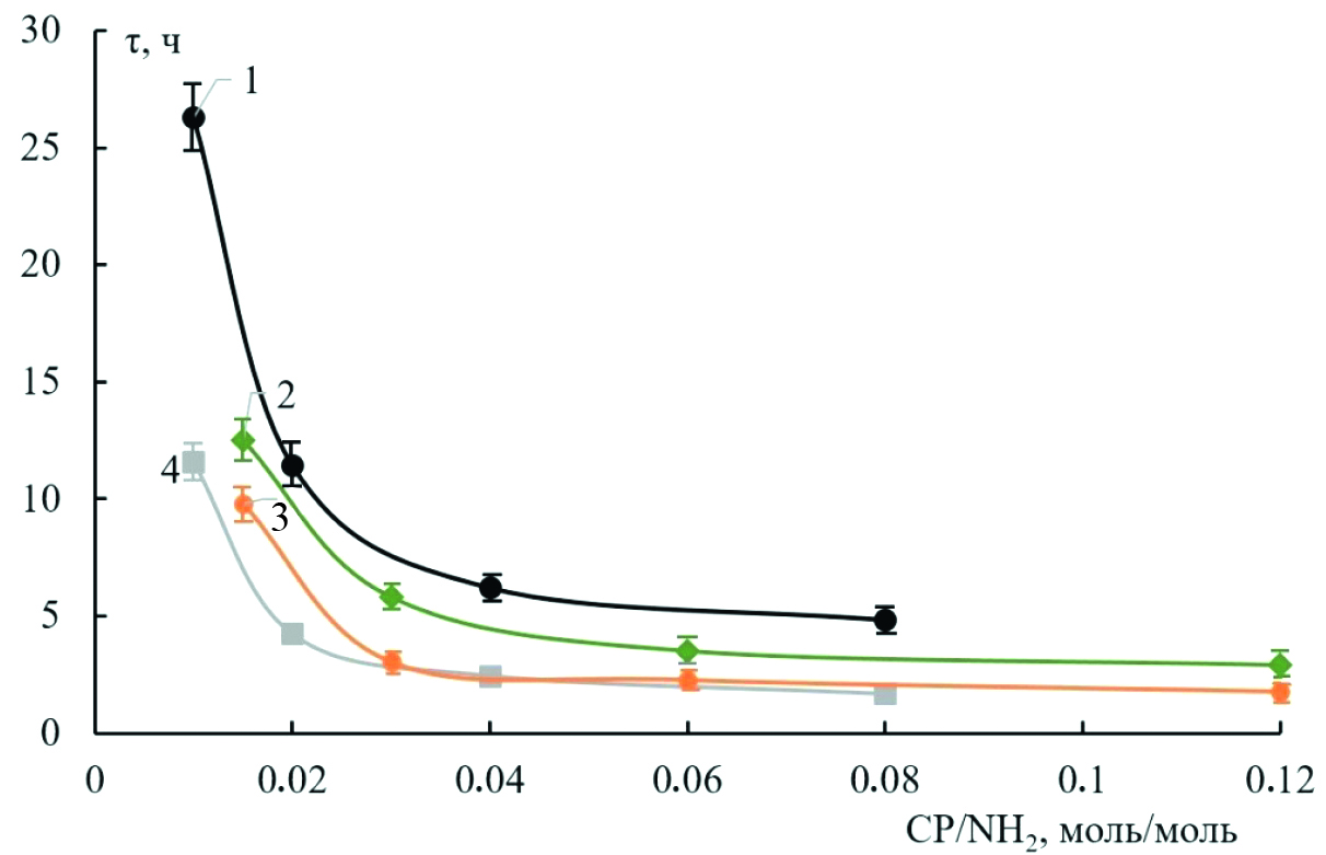 Как видно из полученных зависимостей, при одном и том же мольном соотношении СР/NH2 в случае дженипина гелеобразование в растворах хитозана наступает быстрее, а одинаковое время гелеобразования наблюдается при меньшем содержании сшивающих реагентов (рис. 3), что может быть обусловлено стерическими затруднениями и особенностями строения комплекса ХТЗ-М. При использовании глутарового альдегида такая закономерность соблюдается только при низких соотношениях СР/NH2.