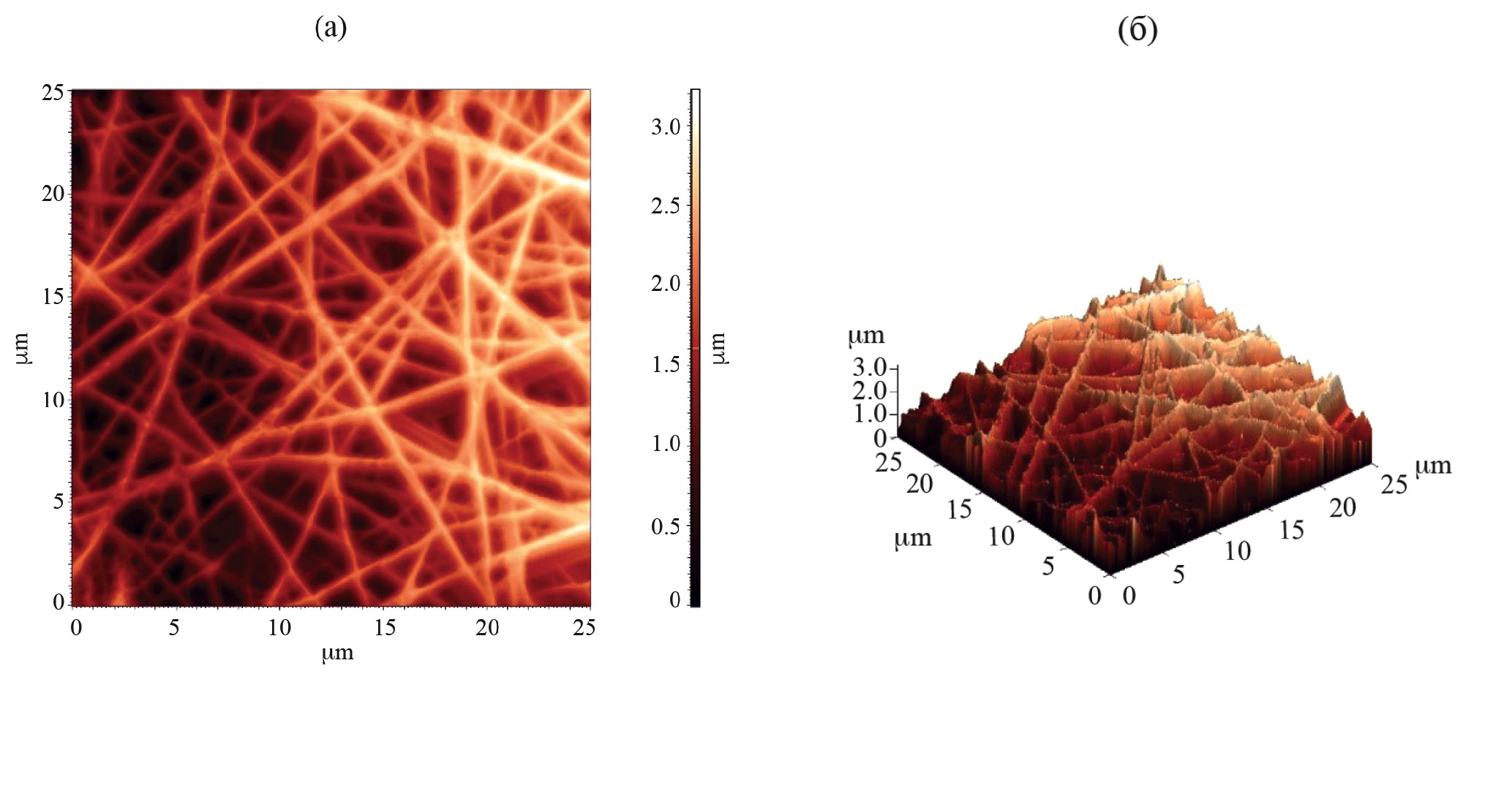 Рис. 4. аСМ-изображение электроформованных волокон из ХТЗ-М, сшитого глутаровым альдегидом (соотношение СР/NH2 = 0.08 моль/моль, pH 5.51): а — 2D-изображение; б — 3D-изображение.