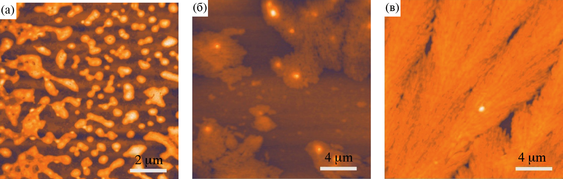 Рис. 1. АСМ-изображения исходных образцов: а – ЛПС (0.1 мг/мл); б – ХН-5 (0.1 мг/мл); в – ХН-5 (0.5 мг/мл).