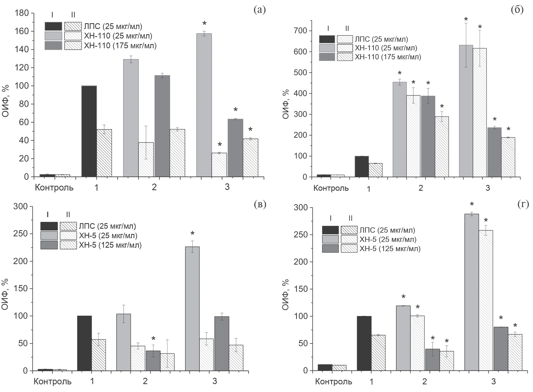 Рис. 4. Взаимодействие ЛПС E. coli (1), комплексов ЛПС : ХН с нейтрофилами крови человека (2) и ЛПС с нейтрофилами, преинкубированными с ХН (3): а, в – инкубация нейтрофилов с образцами (30 мин); б, г – то же с добавлением сыво-ротки крови человека (30 мин). I – суммарная флуоресценция ФИТЦ-ЛПС (ОИФ), прореагировавшего с нейтрофилом; II – флуоресценция ФИТЦ-ЛПС, поглощенного нейтрофилом. ОИФ ФИТЦ-ЛПС (1), прореагировавшего с нейтрофилами, принимали за 100%. (*Разница между образцами 2, 3 и ЛПС статистически достоверна, р < 0.05).