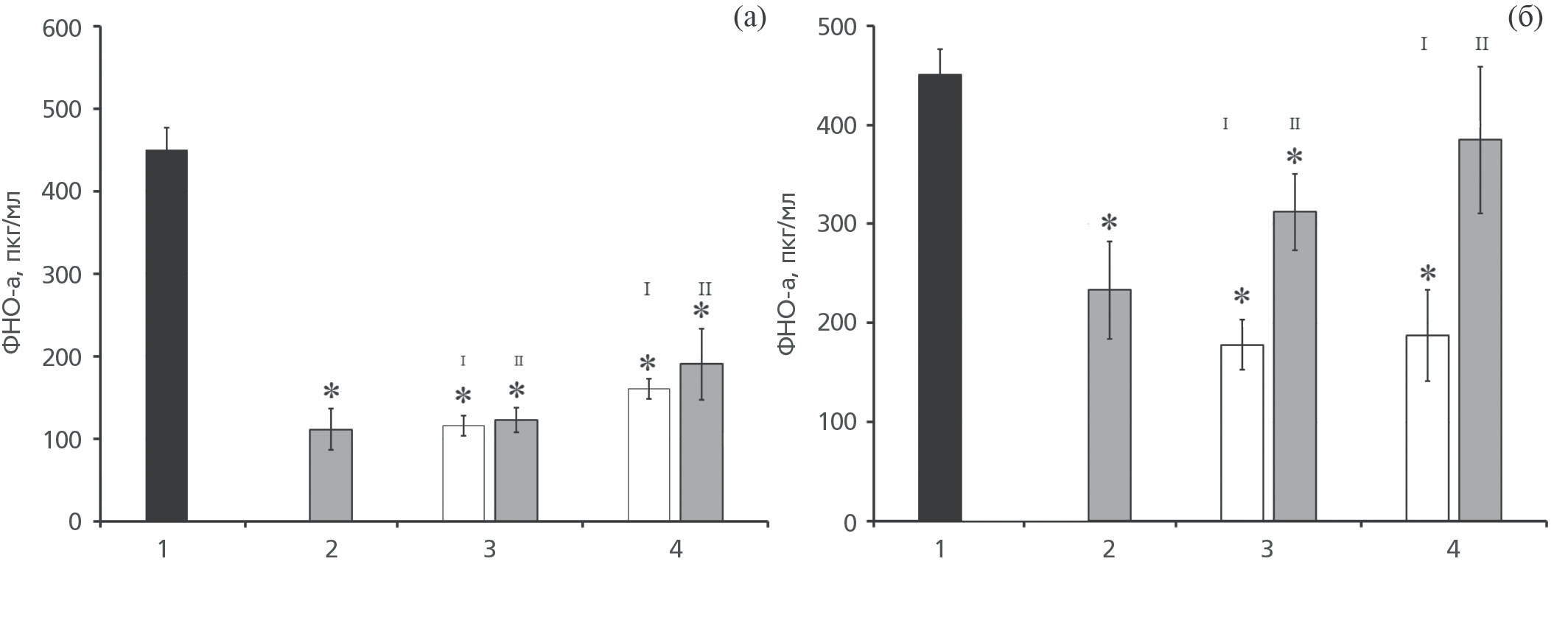 Рис. 5. Продукция ФНО-α клетками цельной крови человека, стимулированная ЛПС (1), ХН (2), комплексами ЛПС : ХН (3) и ЛПС после преинкубации (10 мин) клеток с ХН (4): а – ХН-110; б – ХН-5 (концентрация: ЛПС – 100 нг/мл, ХН – 100 нг/мл (I), ХН-110 − 700 нг/мл, ХН-5 – 500 нг/мл (II). (*Разница между образцами и ЛПС статистически достоверна, р < 0.05).