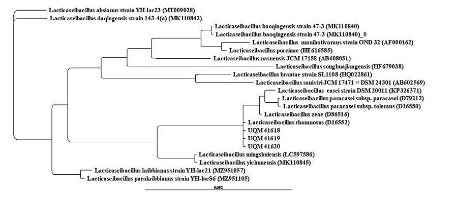 Отобранные МКБ были представлены палочковидными неспорообразующими неподвижными одиночными или собранными в цепочки клетками и росли при 27–37°C с образованием белого осадка в жидких средах. По результатам молекулярно-генетической идентификации путем анализа фрагмента гена 16S рРНК была установлена принадлежность штаммов к роду Lacticaseibacillus, недавно выведенному из р. Lactobacillus и валидно описанному [21]. Штаммы оказались наиболее близкими к L. rhamnosus и L. casei, судя по показателям сходства их последовательностей на 99.93 и 99.65% с известными депонированными последовательностями NR_113332.1 и NR_041893.1 соответственно. По результатам филогенетического анализа установлено высокое родство штаммов UQM 41618, UQM 41619 и UQM 41620 между собой и с типовым штаммом Lacticaseibacillus rhamnosus (рис. 1). Важной особенностью выделенных штаммов Lacticaseibacillus была толерантность к изменениям рН среды с верхним пределом до 9.5. Оптимальный диапазон рН для роста лактобацилл находится в пределах 5.5–6.2 [22], толерантность к повышению щелочности среды известна, а верхний предел рН варьировал у разных видов Lactobacillus и даже штаммов [23]. Таким образом, из кумыса были выделены новые изоляты молочнокислых бактерий, потенциал использования которых рассмотрен ниже.