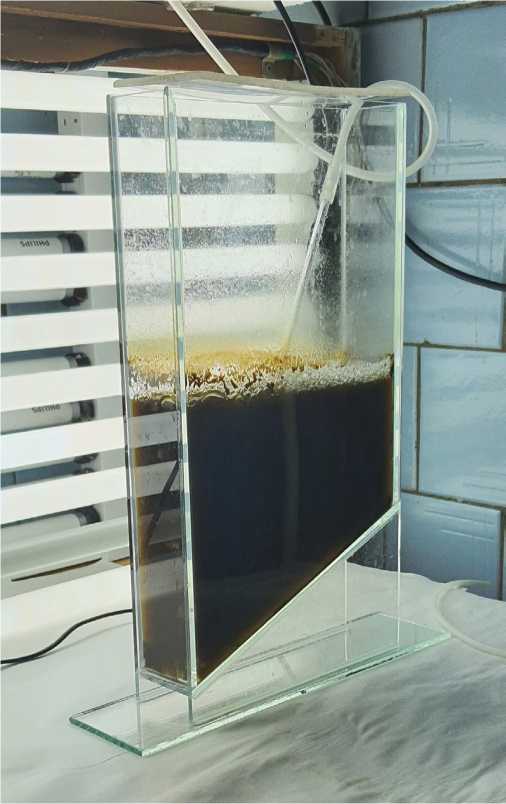 Культуры имели светло-коричневый цвет и оседали на дно (рис. 6). Свойство культуры оседать на дно имеет большое значение для биотехнологии, поскольку облегчает сбор биомассы для дальнейшей экстракции полезных веществ. Стоит отметить, что при этом не возникало проблем с перемешиванием в процессе барботирования, поскольку вид мелкоклеточный, колониальный [19].