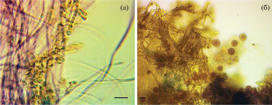 Лабораторное культивирование: изолирование черноморского штамма N. shiloi. В процессе получения монокультуры N. shiloi обнаружены следующие особенности: цепочки клеток вида были тесно связаны с цианобактериями и после нескольких пересевов из накопительной культуры стабильно получали смешанную культуру из двух видов: N. shiloi + Leptolyngbya sp. (рис. 3а) или N. shiloi + Stanieria sp. (рис. 3б).