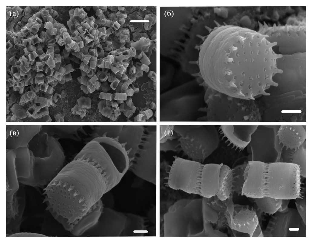 Рис. 4. Монокультура N. shiloi, створки в разных ракурсах в СЭМ: а – клетки в цепочках, масштаб: 10 мкм; б – одиночная клетка, в, г – клетки соединенные попарно краевыми шипами, масштаб: 1 мкм.