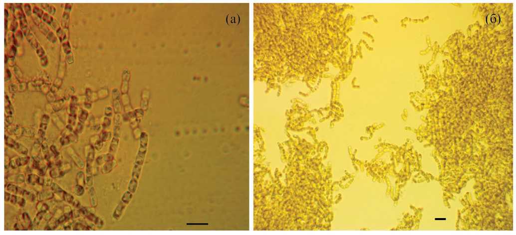 Рис. 3. Клетки N. shiloi в смешанных культурах с цианобактериями: Leptolyngbya sp. (а) и Stanieria sp. (б) в СМ (маштаб 10 мкм).
