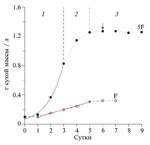 Рис. 7. Динамика биомассы N. shiloi в интенсивной культуре на питательных средах F и 5F. Для накопительной кривой 5F цифрами указаны фазы роста: 1 – экспоненциальная, 2 – замедления, 3 – стационарная. Для накопительной кривой F рассчитана продуктивность в линейной фазе роста по уравнению (2) (отмечено красным) PF/2 = 0.05 г/(л сут), R2 = 0.99. Удельная скорость роста в экспоненциальной фазе для накопительной кривой 5F рассчитана по уравнению (1) (отмечено синим) µ = 0.8 1/сут, R2 = 0.99. Точками указаны средние значения, величина СКО для всех измерений не превышала 0.01 г/л. Стрелкой указан момент измерения ЖК и фукоксантина.
